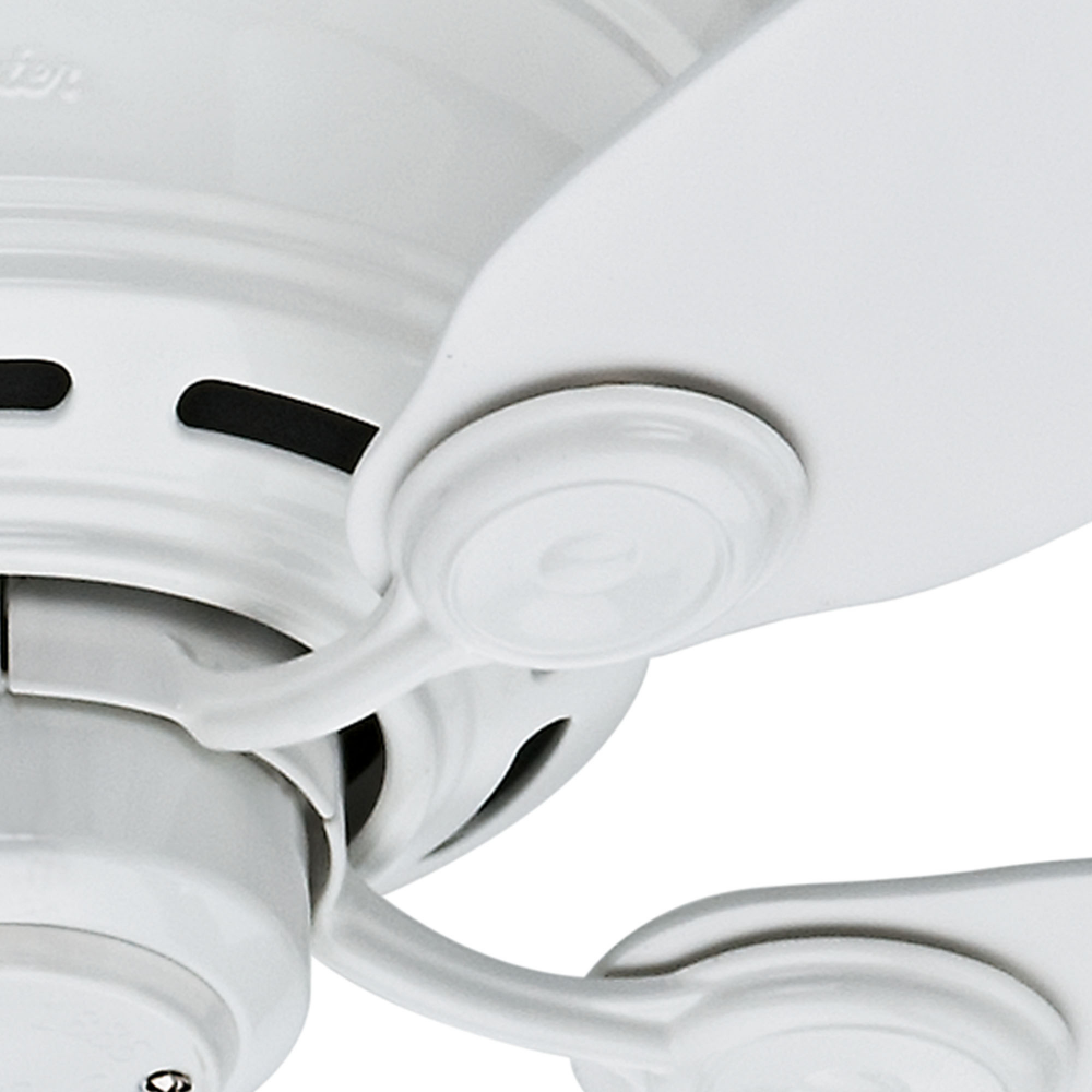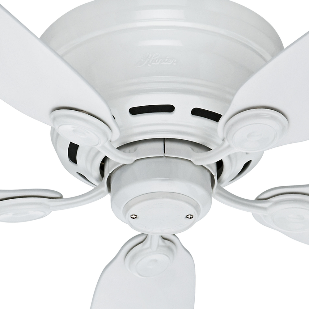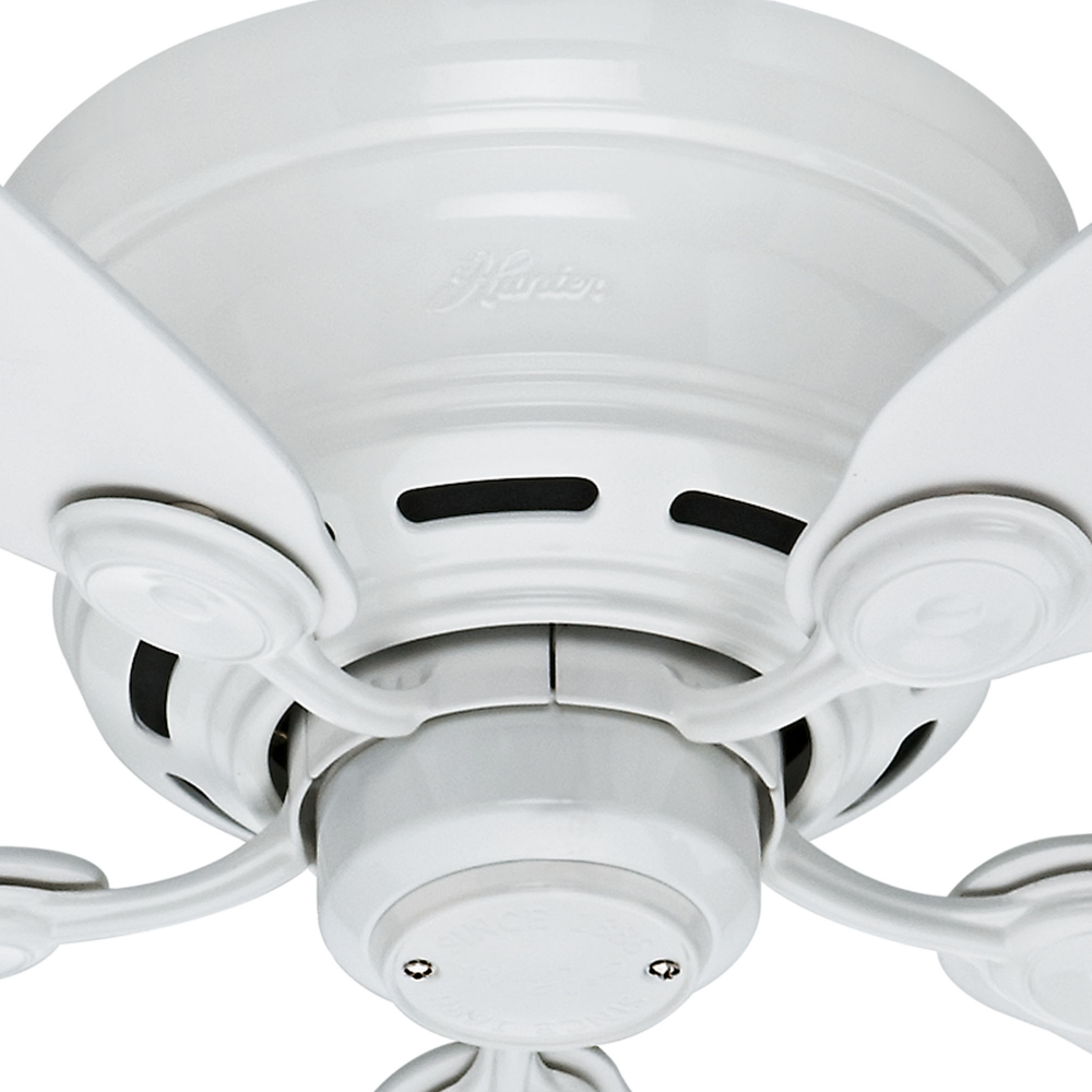 The Hunter Low Profile? IV traditional ceiling fan is designed with housing specially crafted to fit flush to the ceiling making it ideal for use in your small rooms with low ceilings. Available in multiple finishes, this low-profile ceiling fan without light is powered by a three-speed WhisperWind? motor to deliver ultra-powerful and whisper-quiet performance making it the perfect complement for your casual living rooms and bedrooms.
