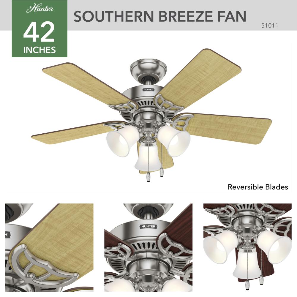 With multiple finishes to choose from, the Southern Breeze ceiling fan is a timeless design that's perfect for your small, classic-styled rooms. This 42-inch ceiling fan is powered by a three-speed WhisperWind? motor delivering ultra-powerful and whisper-quiet performance for optimal year-round comfort.