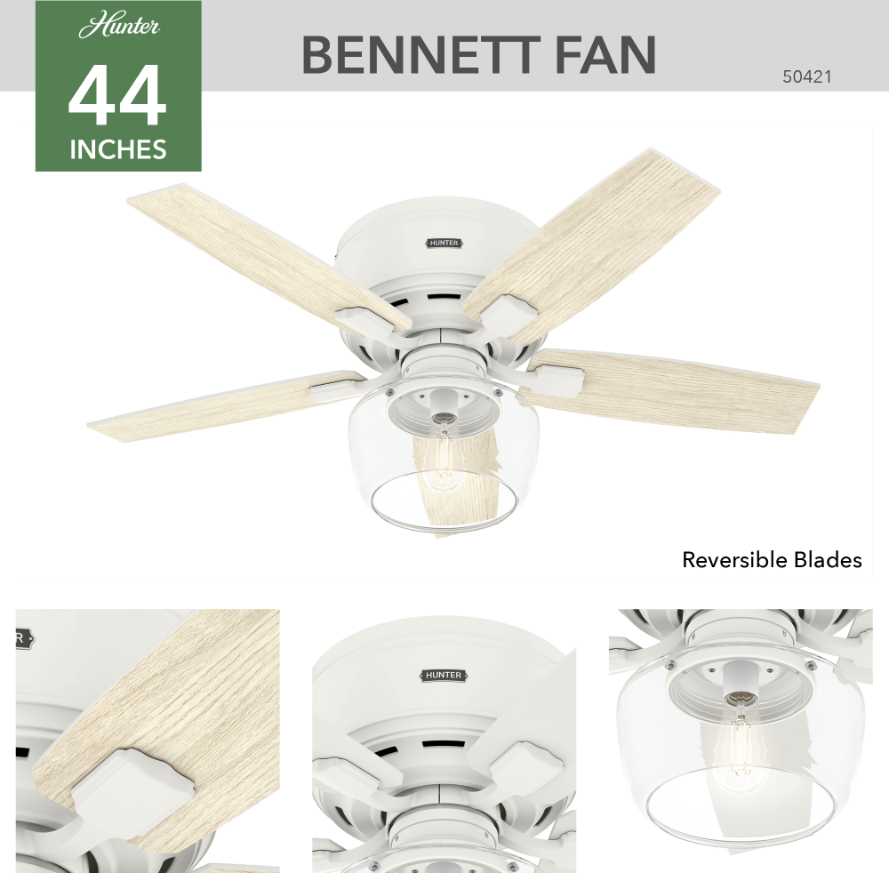A modern take on classic ceiling fan design, the Bennett ceiling fan with LED light and handheld remote adds style to your small living spaces. The transitional design of this indoor ceiling fan makes a statement in various style rooms, from modern home offices to formal living rooms. Designed for rooms with low ceilings, the Bennett low-profile ceiling fan fits flush to the ceiling to ensure optimized airflow without sacrificing head space or style.