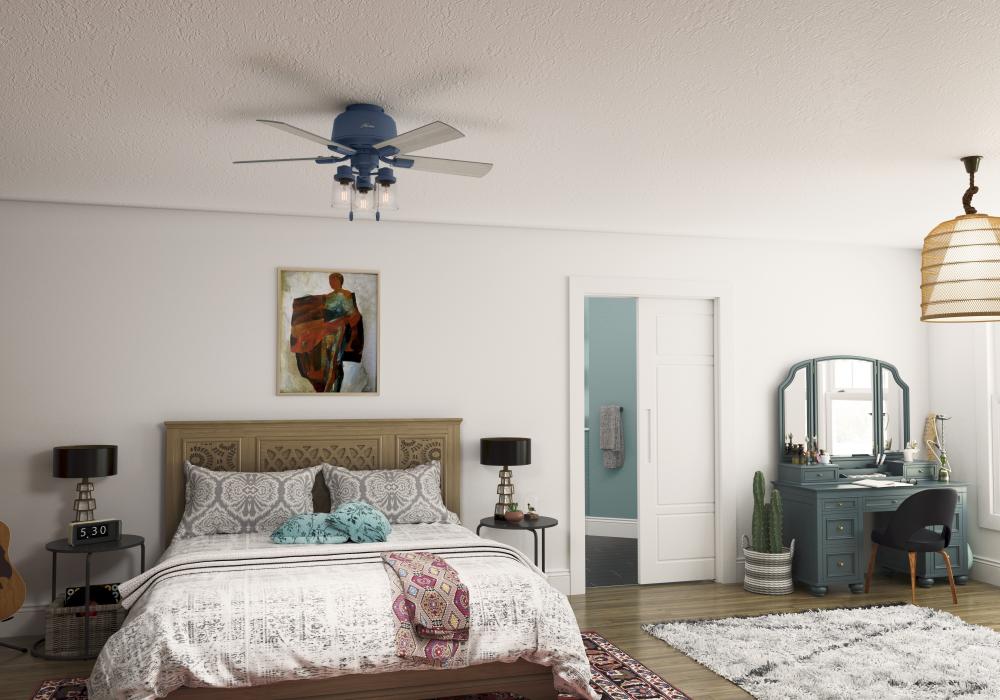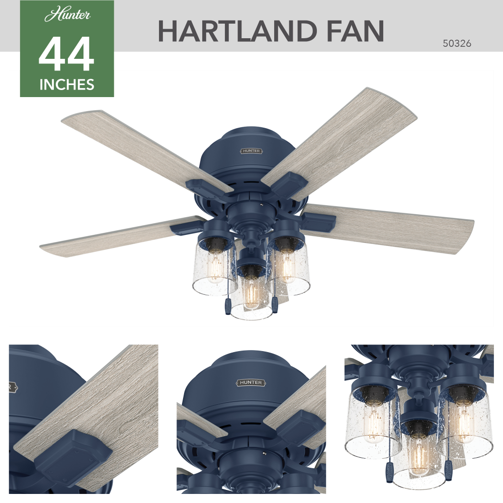 The Hartland chandelier inspired ceiling fan?s clear seeded glass and included Edison LED light bulbs create a stunning look in large spaces. The Noble Bronze and Matte Silver finishes complement other fixtures in farmhouse, casual spaces while the Indigo Blue finish adds a subtle pop of color. This indoor ceiling fan is designed to fit flush in small rooms with ceilings less than 9 feet high. Create a cohesive look in your space by pairing the Hartland ceiling fan with the coordinating light fixtures in its collection.