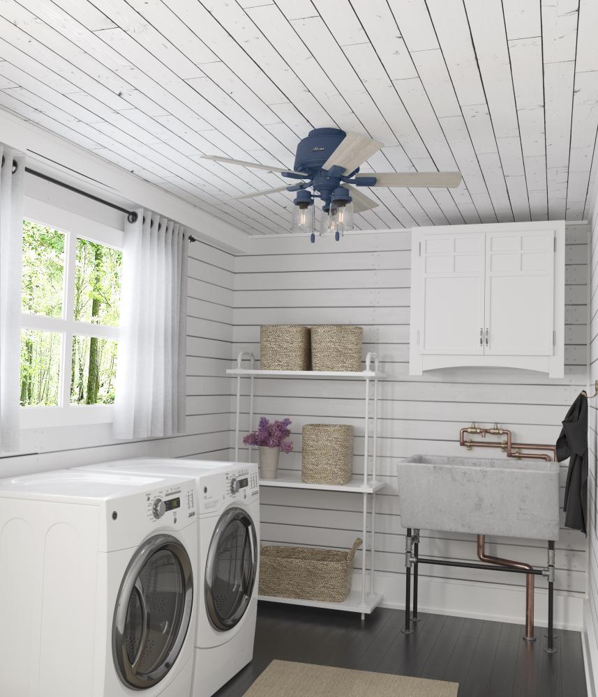 The Hartland chandelier-inspired ceiling fan’s clear-seeded glass and included Edison LED light bulbs create a stunning look in large spaces. The Noble Bronze and Matte Silver finishes complement other fixtures in a farmhouse, and casual spaces while the Indigo Blue finish adds a subtle pop of color. This indoor ceiling fan is designed to fit flush in small rooms with ceilings less than 9 feet high. Create a cohesive look in your space by pairing the Hartland ceiling fan with the coordinating light fixtures in its collection.