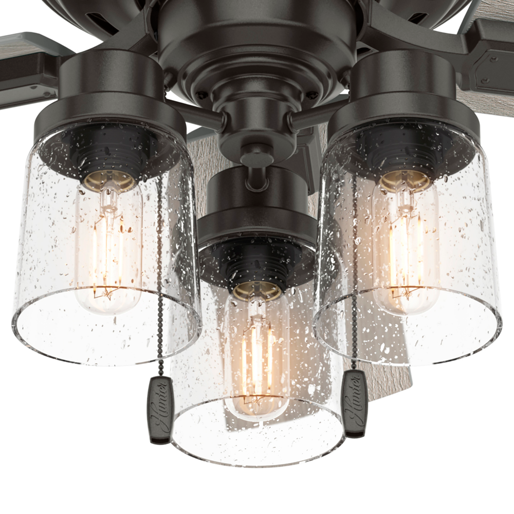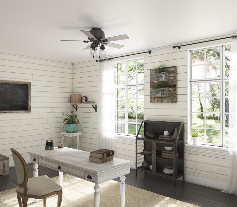 The Hartland chandelier-inspired ceiling fan’s clear-seeded glass and included Edison LED light bulbs create a stunning look in large spaces. The Noble Bronze and Matte Silver finishes complement other fixtures in a farmhouse, and casual spaces while the Indigo Blue finish adds a subtle pop of color. This indoor ceiling fan is designed to fit flush in small rooms with ceilings less than 9 feet high. Create a cohesive look in your space by pairing the Hartland ceiling fan with the coordinating light fixtures in its collection.