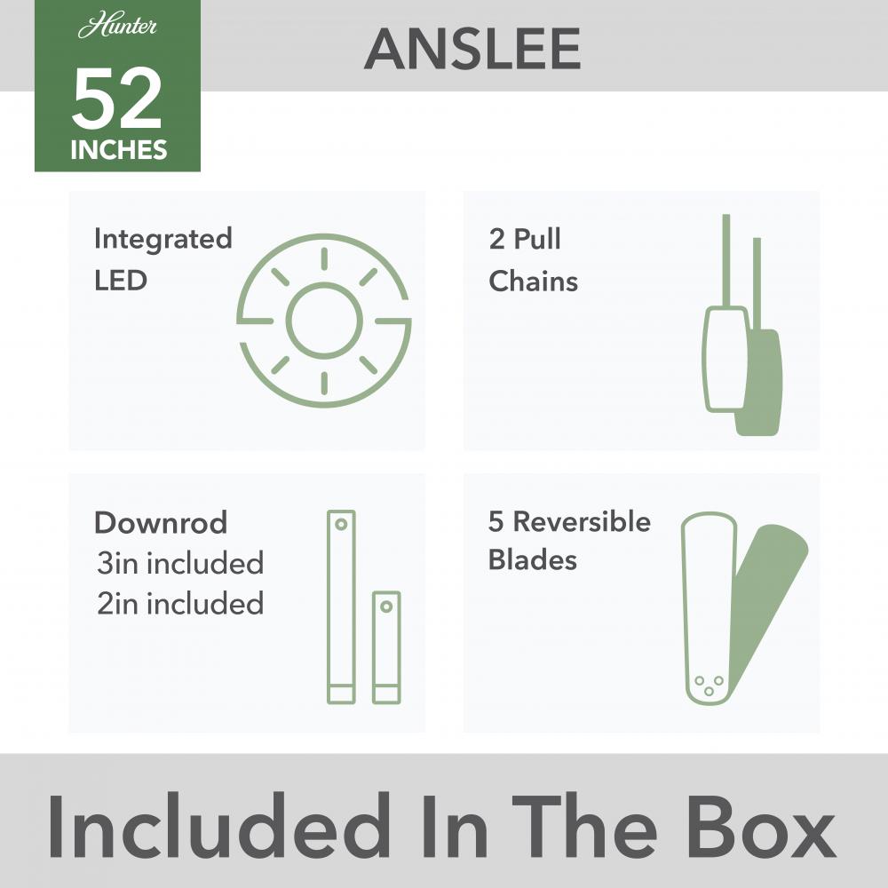 The Anslee modern ceiling fan features clean lines and classic finishes for a versatile design. This 52-inch ceiling fan with LED light illuminates large spaces like bedrooms, living rooms, home offices, and game rooms. Use the included ceiling fan pull chains to easily control the light and fan speed. Featuring our WhisperWind® motor, the Anslee delivers powerful air movement with whisper-quiet performance. Available in a variety of finishes and sizes, the Anslee Collection makes it easy to choose a ceiling fan and create a cohesive look throughout your home.