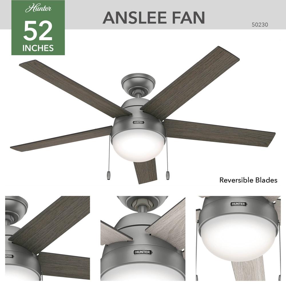 The Anslee modern ceiling fan features clean lines and classic finishes for a versatile design. This 52-inch ceiling fan with LED light illuminates large spaces like bedrooms, living rooms, home offices, and game rooms. Use the included ceiling fan pull chains to easily control the light and fan speed. Featuring our WhisperWind® motor, the Anslee delivers powerful air movement with whisper-quiet performance. Available in a variety of finishes and sizes, the Anslee Collection makes it easy to choose a ceiling fan and create a cohesive look throughout your home.