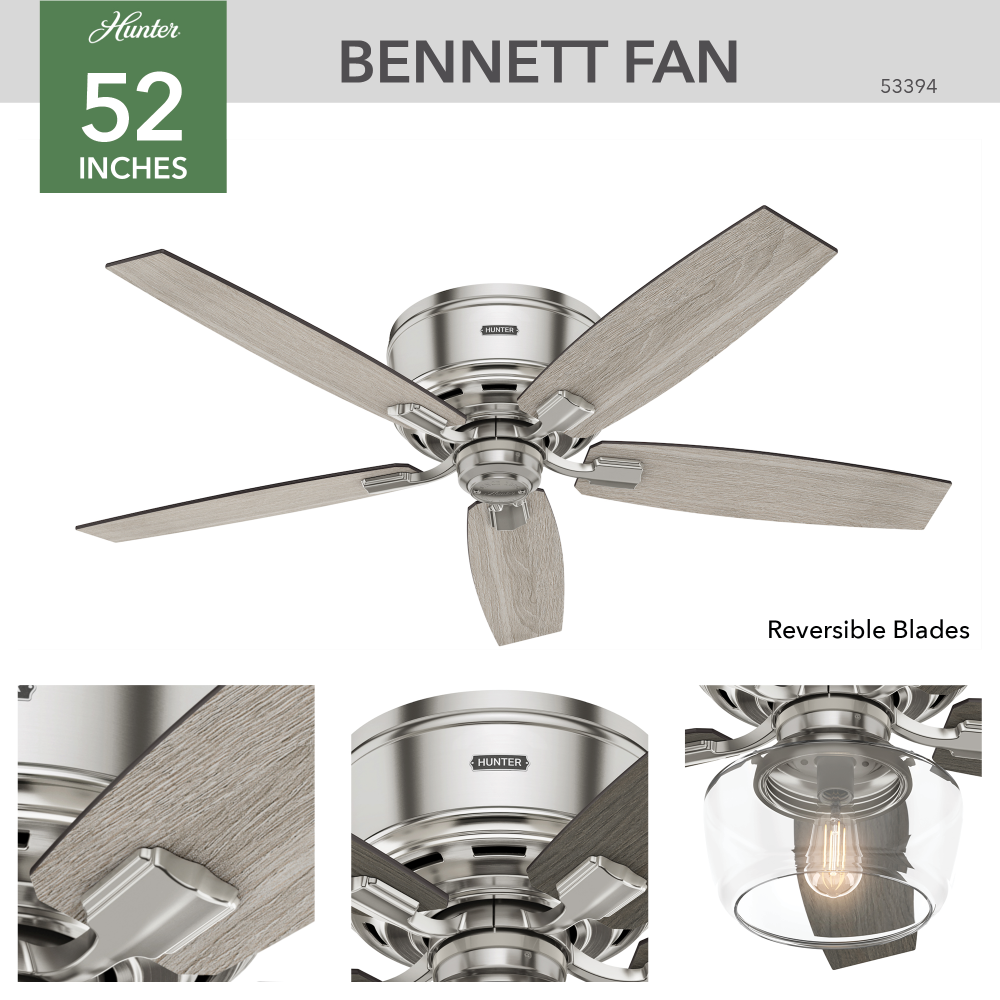 Regarded as one of our best ceiling fans by designers and homeowners alike, the renewed classic look of a Bennett ceiling fan will add flair to your traditional living spaces. A smoked yet clear open glass globe completes this fan's harmonious color palette while adding a touch of glamour. Whether you like your light moody or as bright as possible, the energy-efficient LED Edison bulb enhances the ambiance of your room while a powerful WhisperWind? motor will make your formal, chic spaces as functional as they are stylish. The low-profile design makes this fan ideal for rooms with lower ceilings.