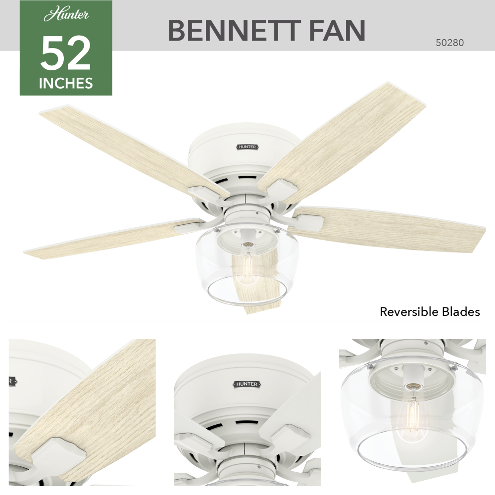 Regarded as one of our best ceiling fans by designers and homeowners alike, the renewed classic look of a Bennett ceiling fan will add flair to your traditional living spaces. A smoked yet clear open glass globe completes this fan's harmonious color palette while adding a touch of glamour. Whether you like your light moody or as bright as possible, the energy-efficient LED Edison bulb enhances the ambiance of your room while a powerful WhisperWind? motor will make your formal, chic spaces as functional as they are stylish. The low-profile design makes this fan ideal for rooms with lower ceilings.