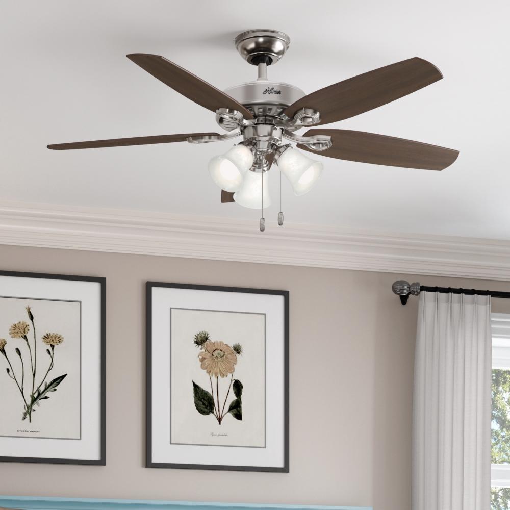 A mainstay in the Hunter collection of fans, the casual, traditional design of the Builder classic ceiling fan with light complements your rooms without overpowering them. The Builder fan includes three LED light bulbs to help illuminate your large indoor rooms like bedrooms and living rooms. Featuring WhisperWind® motor technology, it delivers the quiet, ultra-powerful air performance you expect from a ceiling fan. Available in a variety of finishes and sizes, use the Builder Collection to create a cohesive look throughout your home.