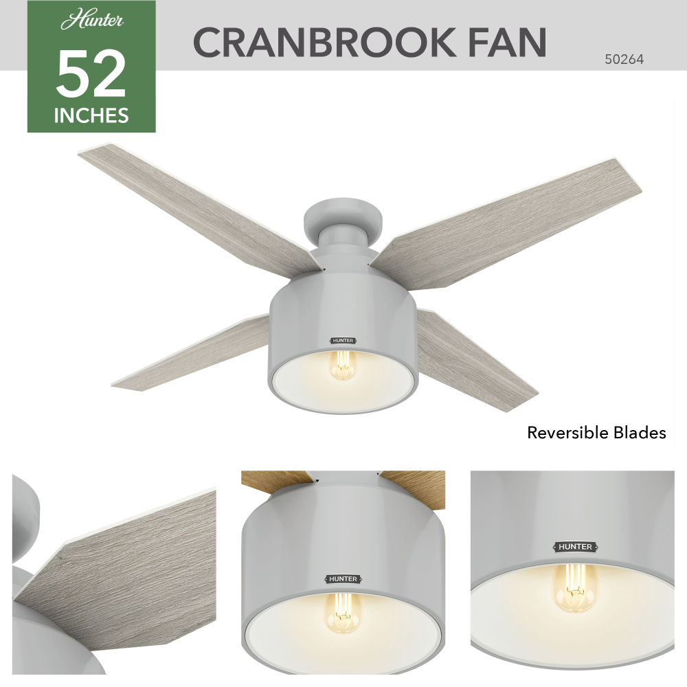 A tribute to a time long gone, the Cranbrook is a mid-century modern ceiling fan with a one-of-a-kind look that is both vintage and current. The open hood and tapered blades surround an exposed bulb for a style that is totally original and totally Hunter. The Cranbrook features an energy-efficient LED light bulb and a reversible three-speed WhisperWind® motor that delivers ultra-powerful air movement with whisper-quiet performance. With a design influenced by mid-century modern furniture and unique finishes including Mint and Blush Pink, this is a centerpiece just looking for a home.
