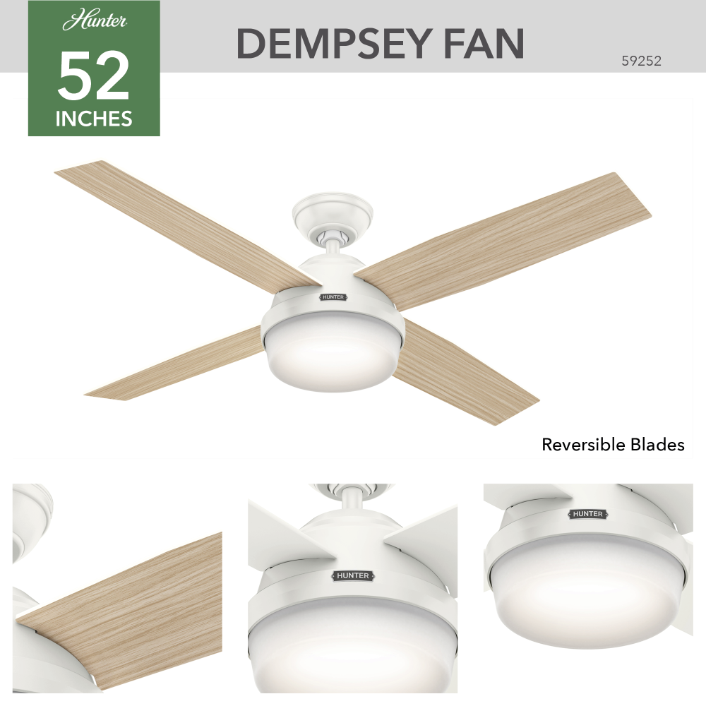 A contemporary fan with mass appeal, the Dempsey will fit flawlessly in your home's modern interior design. The beautiful, clean finish options work together with the high contrast of angles throughout the design to create a look that will keep your space looking current and inspired. This fan is damp rated for covered porches or any area with moisture. Fully-dimmable, energy-efficient LED bulbs give you total control over your lighting, while the 52-inch blade span is ideal for large rooms. We have a full collection of Dempsey fans so you can maintain a consistent look while tailoring the size and features to each room in your house.