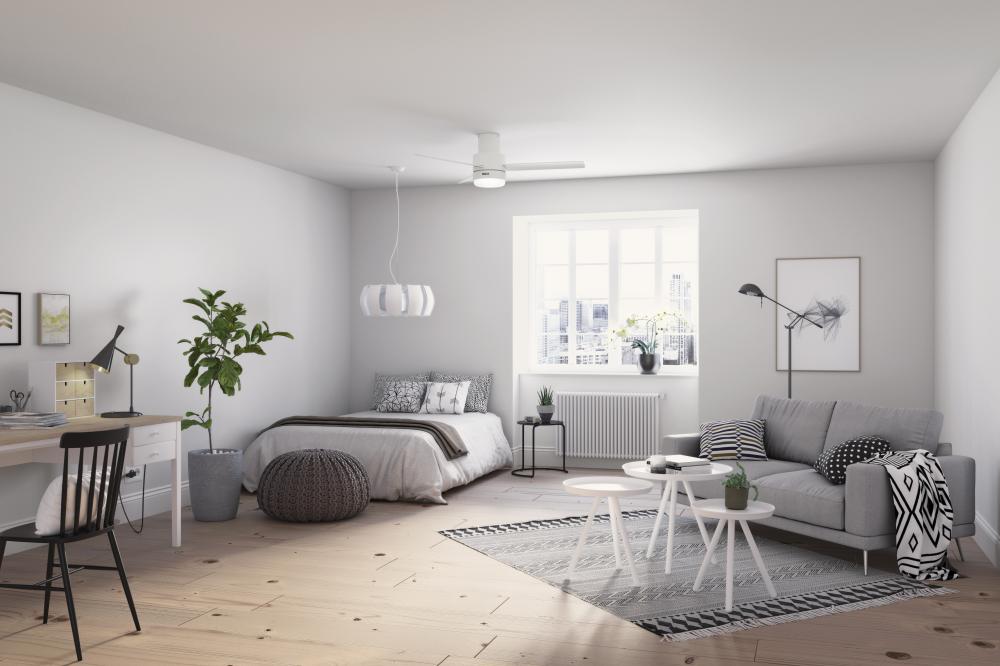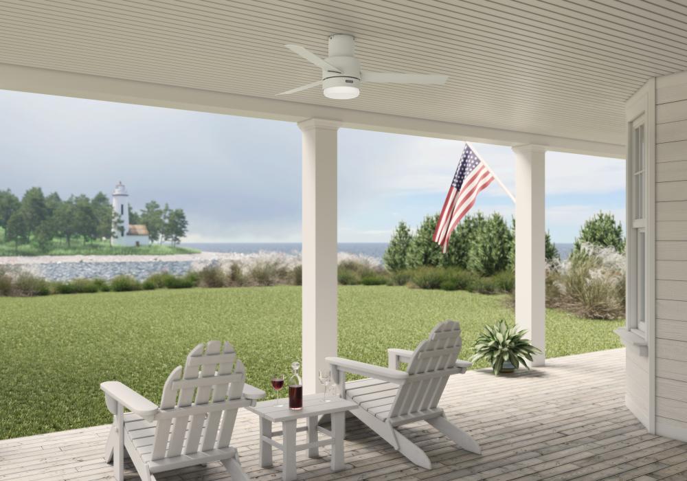 The simple design and clean lines of the Gilmour outdoor ceiling fan complement your casual, modern covered porches and patios. The Matte White finish adds a bright, clean look while the Flat Matte Black finish adds a bold one. This large ceiling fan fits close to the ceiling to provide optimal performance in rooms with low ceilings without sacrificing style or head room.