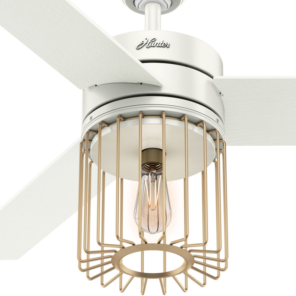 Loved by interior designers, the Ronan ceiling fan features a wire-form brass cage surrounding a vintage-style, energy-efficient LED Edison light bulb. The warm metal and tonal blades create a nice contrast with the fan body. A reversible, three-speed WhisperWind® motor delivers ultra-powerful air movement with a whisper-quiet performance so you get the cooling power you want without the noise. This 52-inch Designer Series caged ceiling fan is versatile and ready to add to your home's modern style.