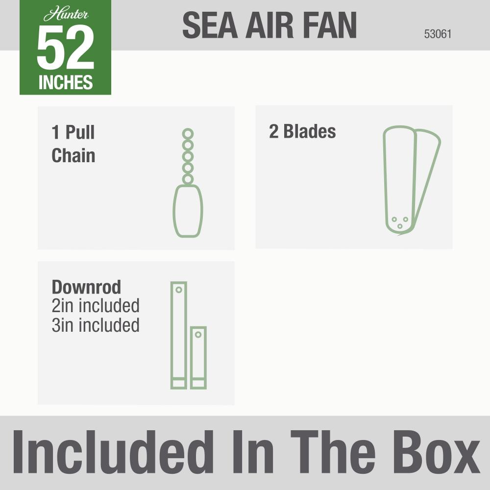 The Sea Air's traditional design and various color options will complement any large area in or outside your home. Made with stainless steel hardware to resist rust, this wet-rated fan is perfect for spaces exposed directly to weather like patios and pergolas. The 52-inch blades of this outdoor ceiling fan are powered by a reversible, three-speed WhisperWind® motor delivering ultra-powerful air movement with a whisper-quiet performance so you get the cooling power you want without the noise. Be sure to check out the wet-rated accessory light kits Hunter® has to offer.