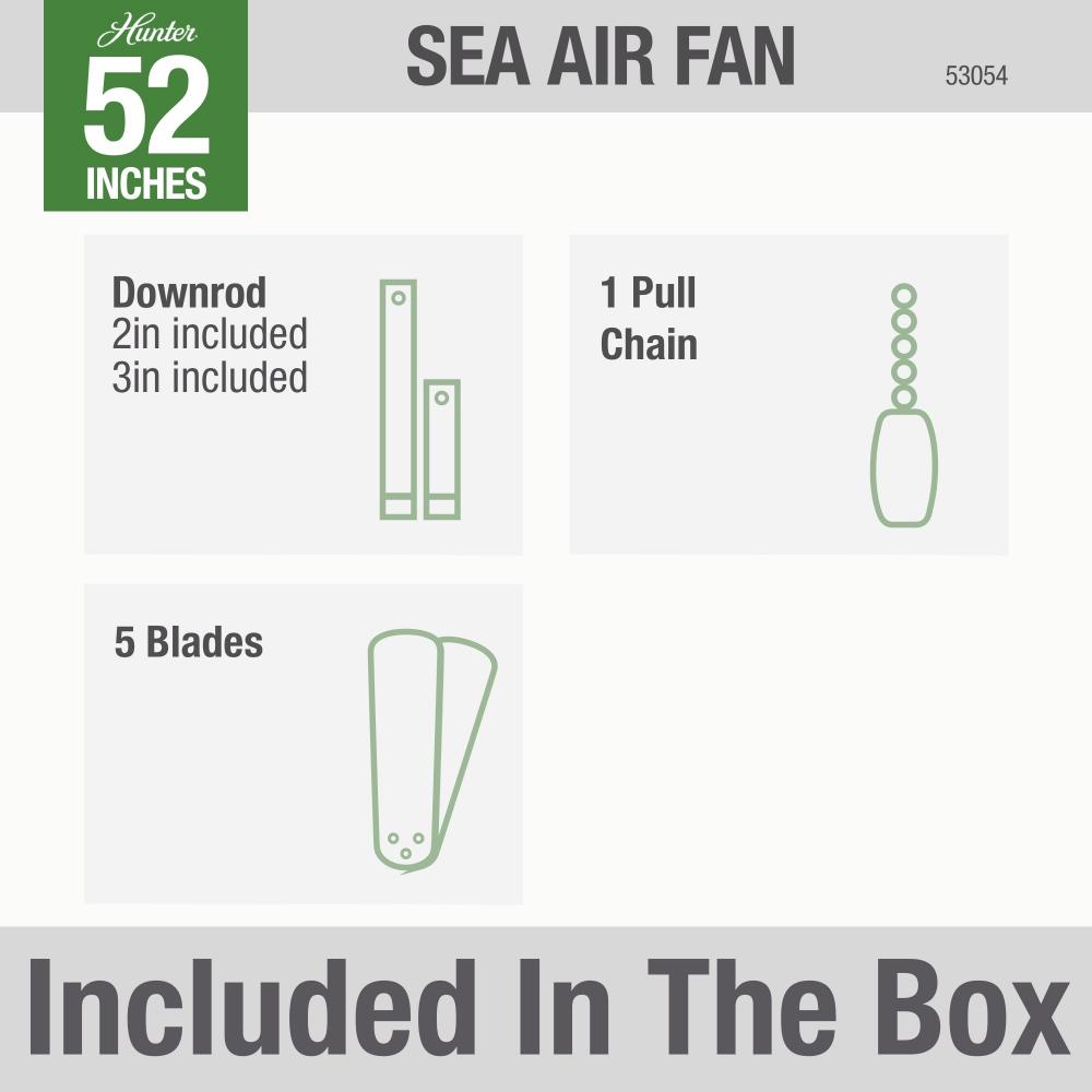 The Sea Air's traditional design and various color options will complement any large area in or outside your home. Made with stainless steel hardware to resist rust, this wet-rated fan is perfect spaces exposed directly to weather like patios and pergolas. The 52-inch blades of this outdoor ceiling fan are powered by a reversible, three-speed WhisperWind? motor delivering ultra-powerful air movement with a whisper-quiet performance so you get the cooling power you want without the noise. Be sure to check out the wet-rated accessory light kits Hunter? has to offer.