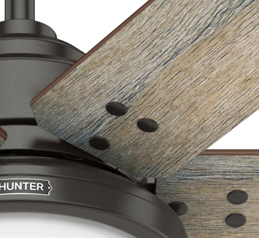 The Warrant great room ceiling fan is available in two sizes – a 60-inch ceiling fan and a 70-inch ceiling fan – to efficiently cool open-concept rooms while adding style to your decor. This farmhouse-style ceiling fan with a LED light features six reversible blades that are reminiscent of a windmill with rivet hardware attaching the blades to the housing. As a Hunter ENERGY STAR® certified ceiling fan, the Warrant is 64% more efficient on average than conventional fans* while helping you save you money on cooling costs.