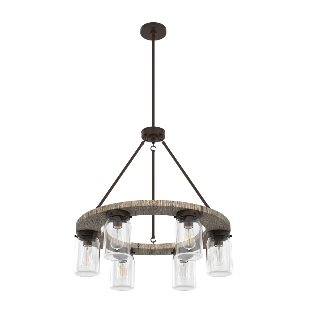 Simply charming, the Devon Park round chandelier’s rustic wood finishes and ball jar inspired glass shades create a look perfect for rustic and farmhouse style spaces. This 6-light chandelier provides opportunity for ample lighting. The warm glow from Edison LED bulbs creates a welcoming ambiance in your space.