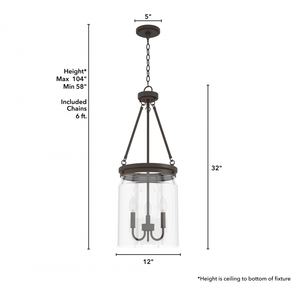 CUSTOMIZABLE HANGING OPTIONS: With the minimum required chain, the hanging length is 58 inches. When using all of the included chain, the maximum hanging length is 104 inches.
