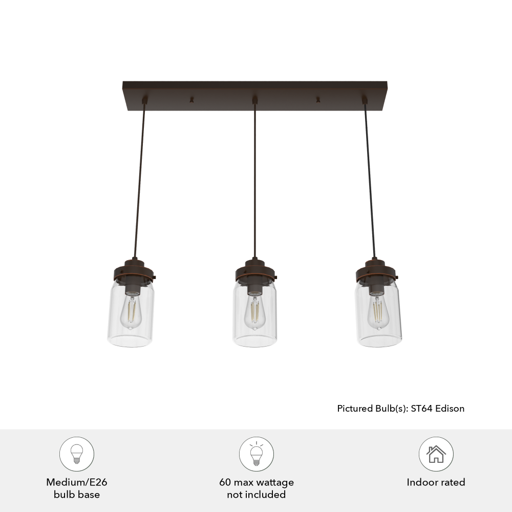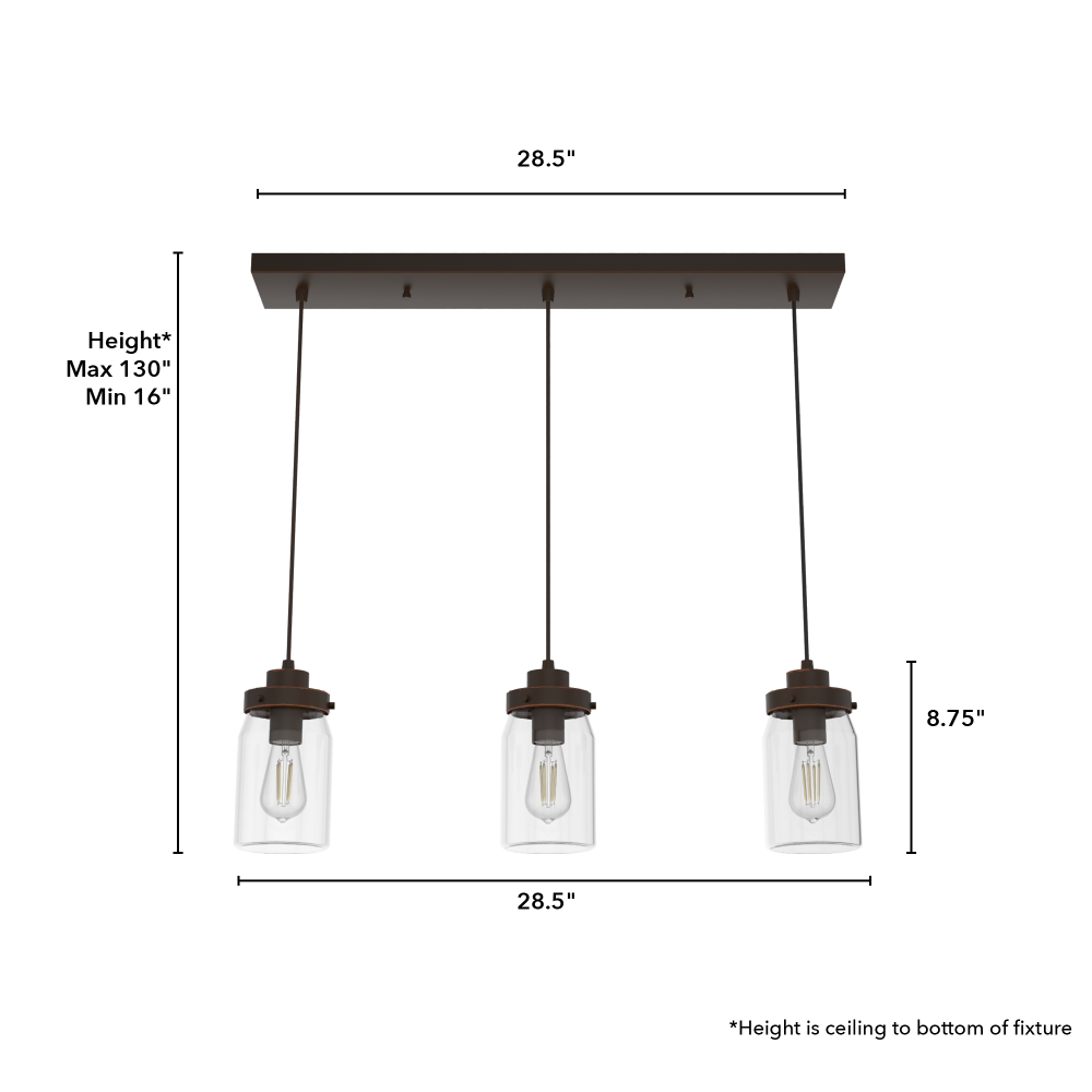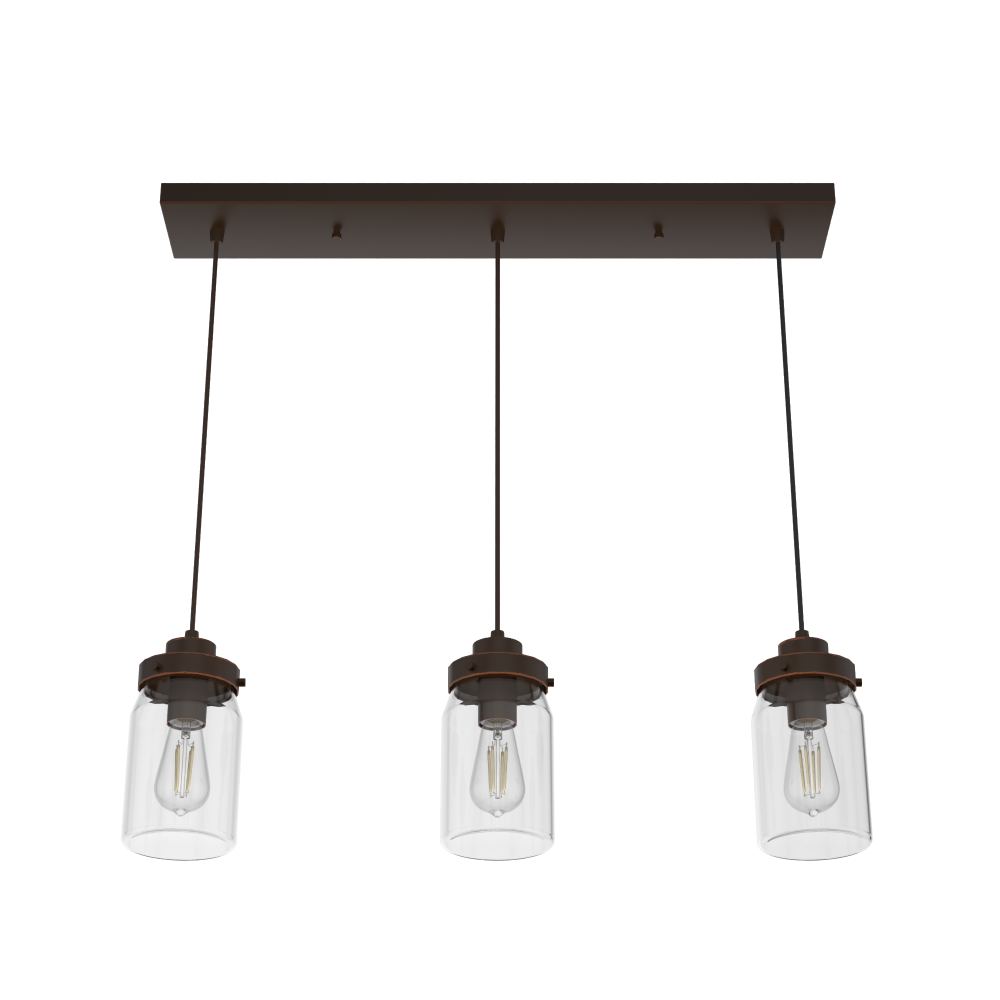 Create a look that’s all your own with the Devon Park 3 Light Cluster Linear light fixture: The mini pendants are customizable to the varying heights you choose. The three, evenly spaced pendants are wired on one base for easy installation, whether it’s above your kitchen island or for unique dining room lighting above the table. Use this rustic, farmhouse cluster pendant lighting with our corresponding Devon Park ceiling fan collection for a cohesive look in your space.