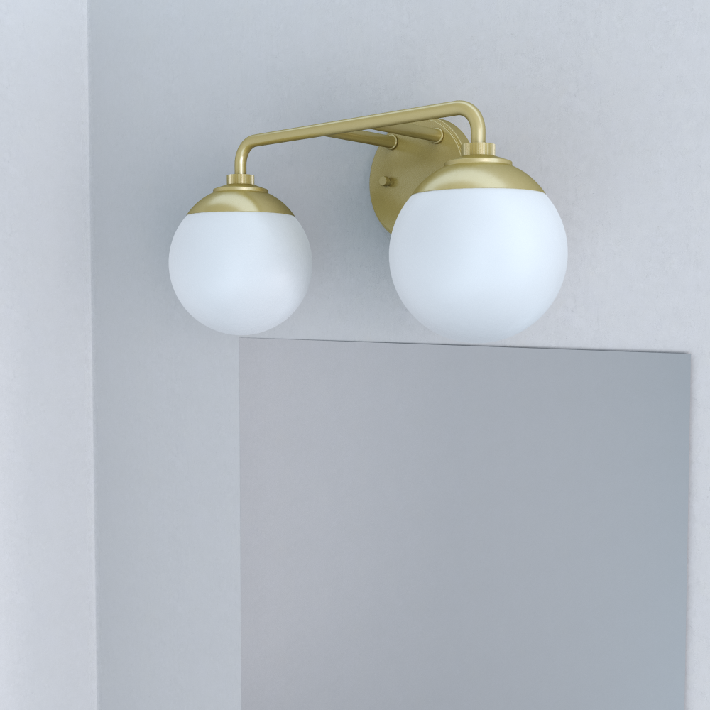 Big style for small spaces. The Hepburn modern 2-light vanity light blends the grandness of 1920 theaters with the retro, geometric forms of mid-century modern design. A simple design with beautiful finishes and a cased white glass – the simplest things can make the biggest impact.
