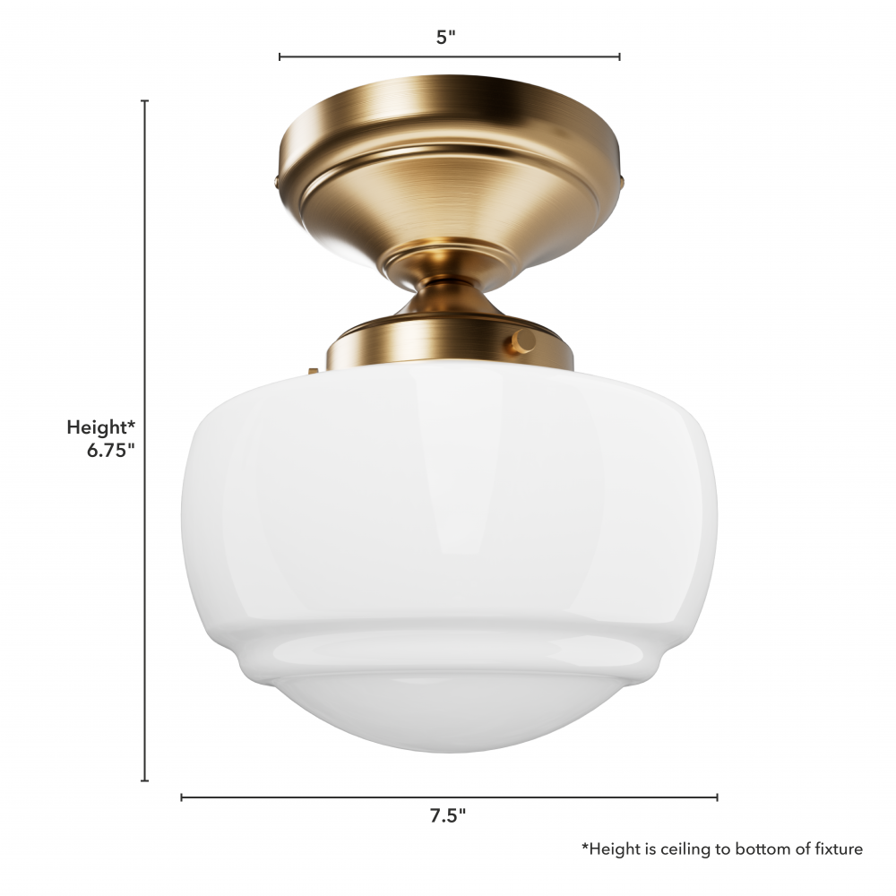 Iconic style, reimagined. Inspired by the classic American schoolhouse light, the Saddle Creek semi-flush mount combines simple design elements to create a subtly sophisticated style. Available in cased white or clear seeded glass, the Saddle Creek’s semi-flush mount makes this fixture an ideal choice for smaller spaces or rooms with low ceilings. Mix and match with other fixtures from this collection or from our ceiling fan designs.