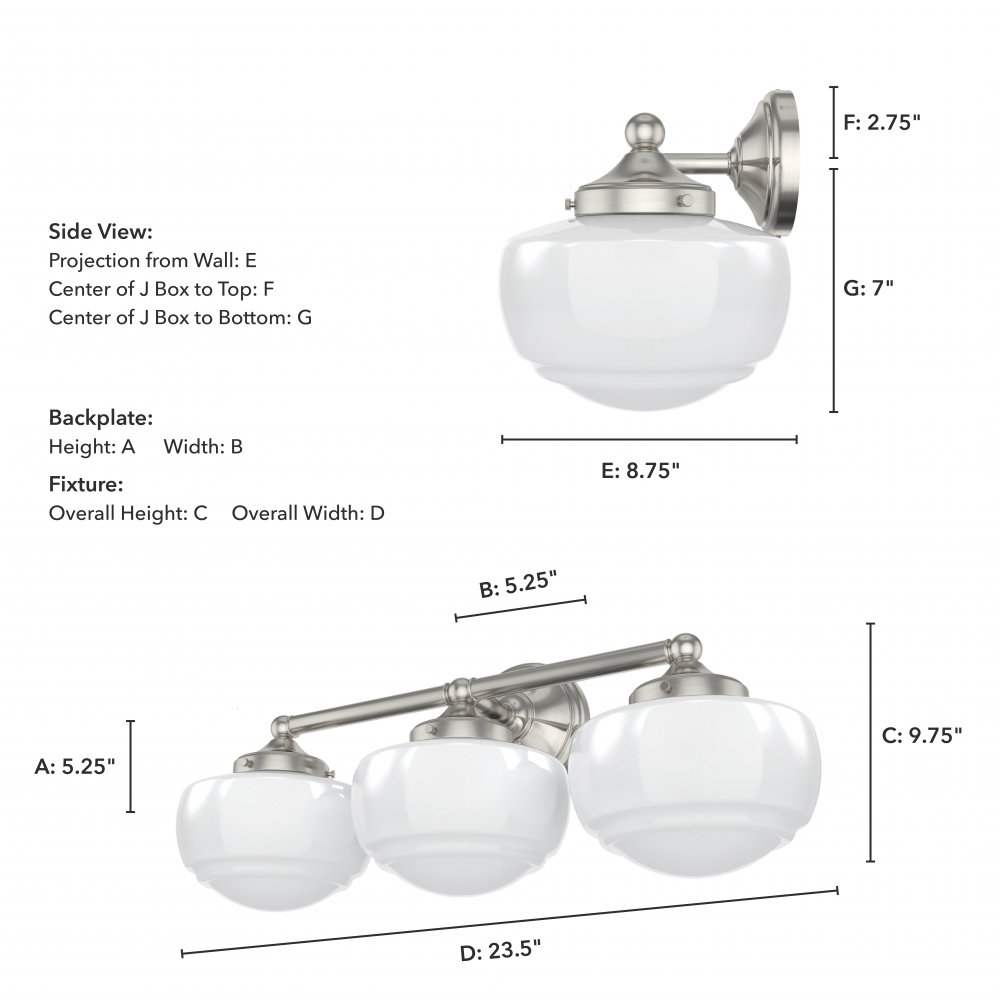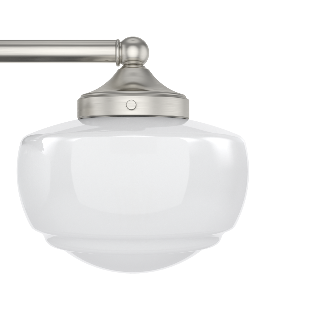 Introduce a vintage element to your vanity with the Saddle Creek fixture, inspired by the iconic American schoolhouse light. This vanity lighting will reflect a warm glow that illuminates subtle detailing within the glass. The Saddle Creek’s simple metal finish and fittings lend a subtlety to the light’s sophisticated style. Mix and match with other fixtures from this collection or from our ceiling fan designs.