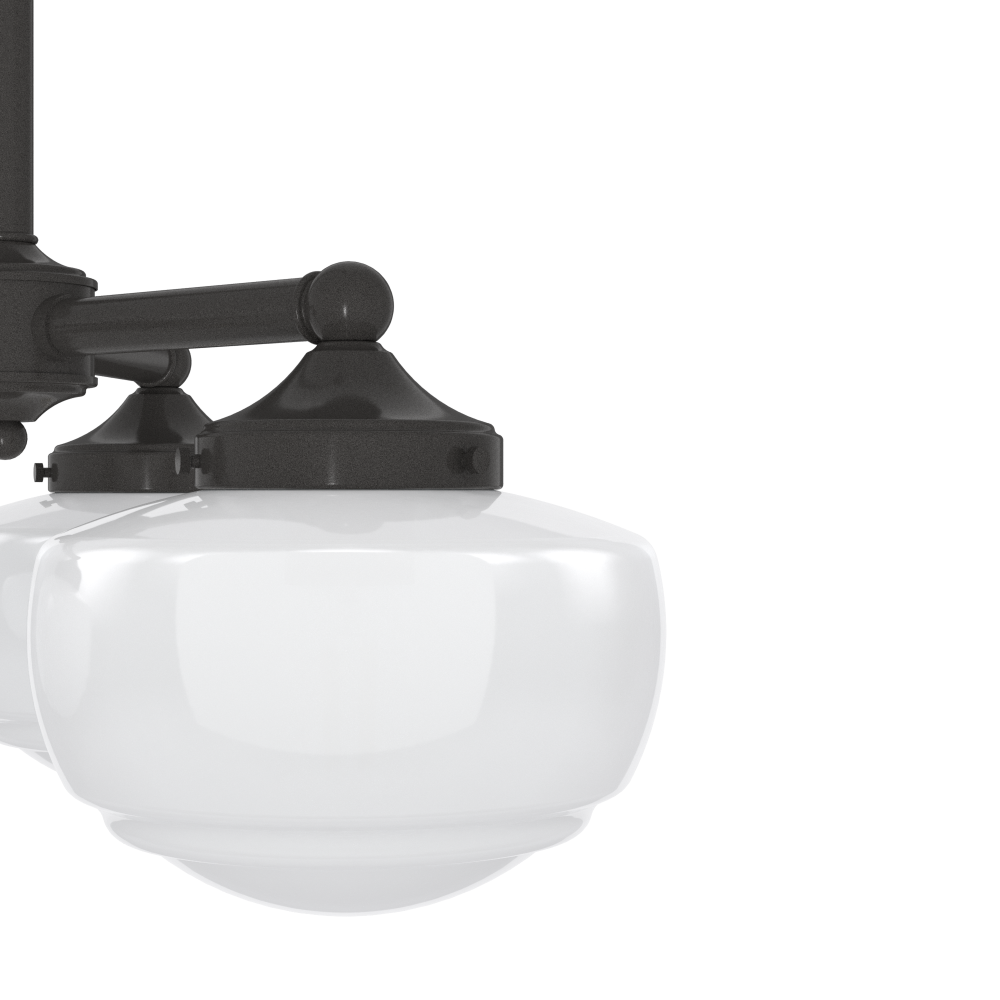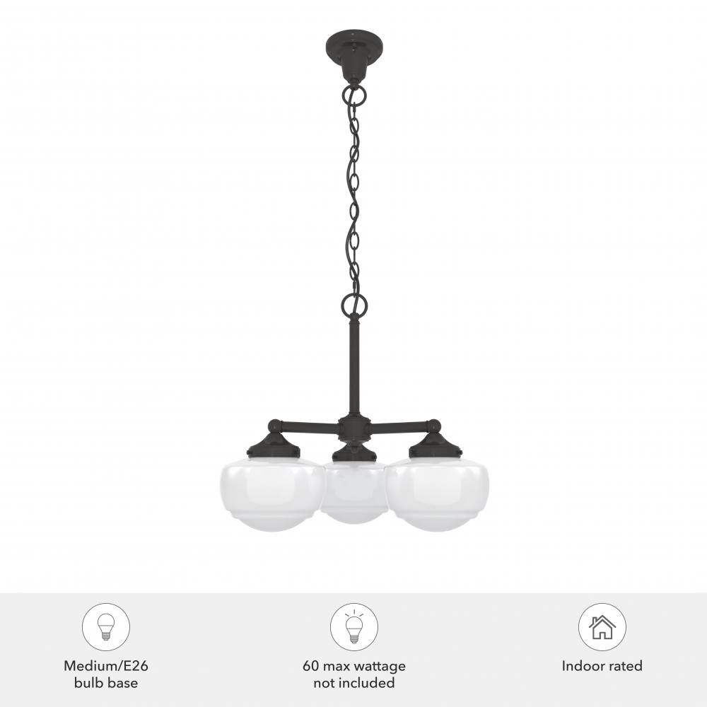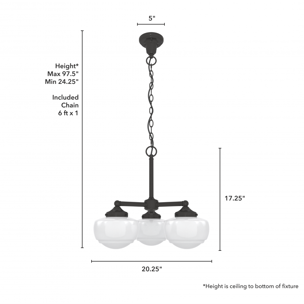 Traditional design meets schoolhouse style. Inspired by the iconic American schoolhouse light, our Saddle Creek convertible chandelier features a trio of glass-globed shades designed to delight from any height. Choice of finish and cased white or clear seeded glass lets you tailor this lighting fixture to your taste and existing decor. Mix and match with other fixtures from this collection or from our ceiling fan designs.