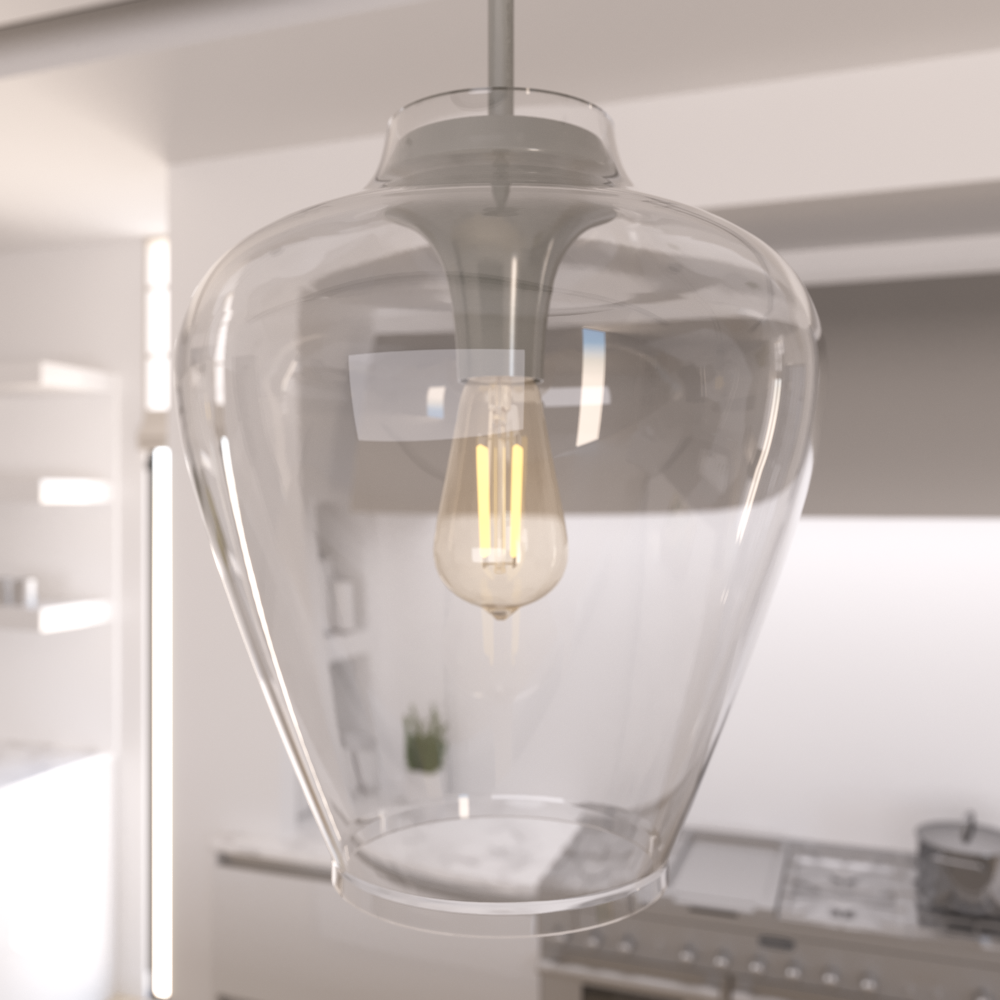 Minimal design can often have the biggest impact. The soft curves of the Vidria pendant light’s vase shaped glass is simple yet stunning for dining room, foyer, or kitchen island lighting. Designers thoughtfully created a modernist effect in the Vidria, giving this grand pendant glass the appearance of floating above the light bulb. Mix and match with other fixtures from this collection or from our ceiling fan designs.