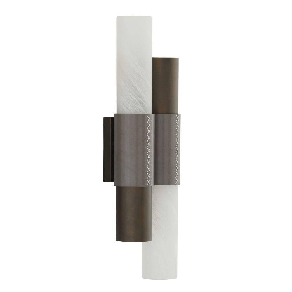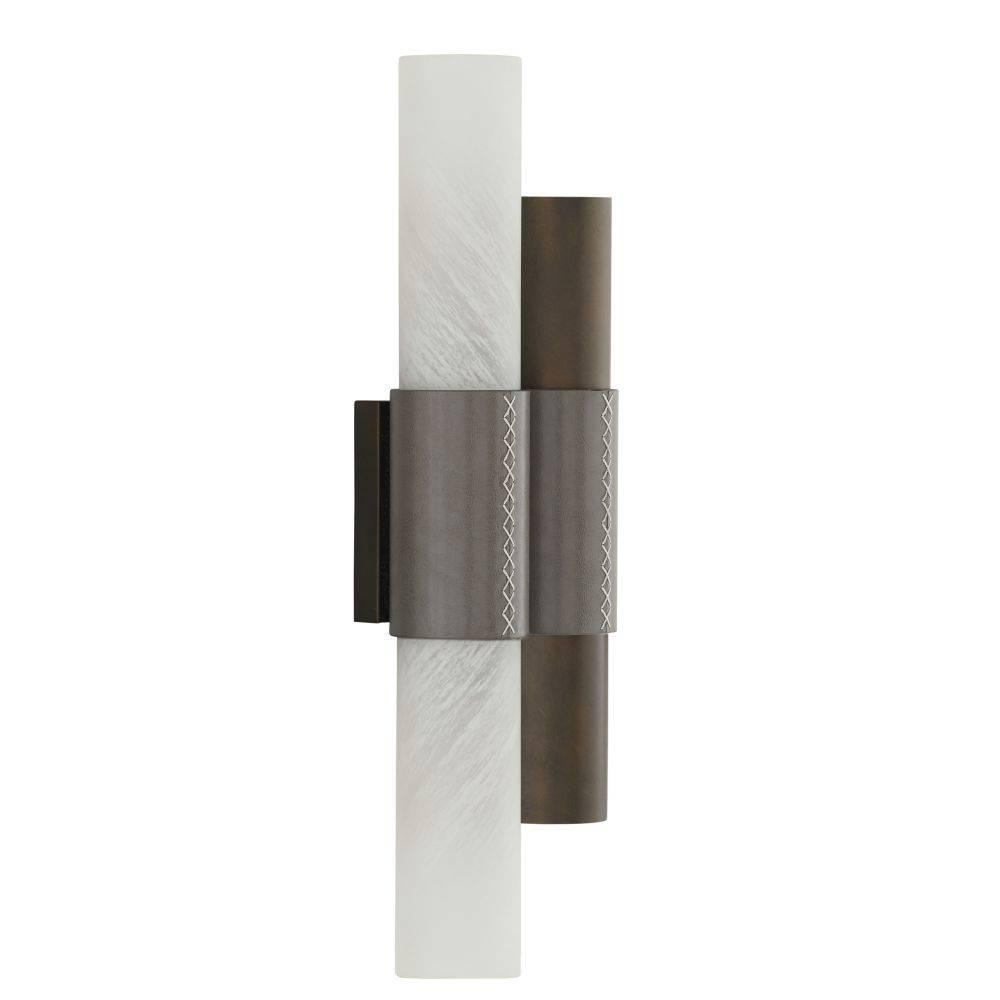 Meant to be mirrored in a pair, the clever Huntington features interchangeable cuffs of matte swirl glass and English bronze-plated steel. Bands of topstitched charcoal leather add a tailored edge to the industrial vibe. Damp-rated, although limited covered outdoor areas may affect finish. Finish will vary.