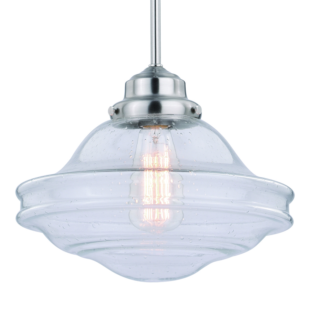 The Huntley is a timeless collection inspired by mid-century small-town aesthetics. The vintage school house glass is the focal point of this design : with its unique profile and glass options. Offered in two finish and glass options, this versatile light will provide a unique accent to a variety of kitchen, dining, and bathroom settings. Medium screw base lamping provides maximum light output. Mountable in up light or down light configuration. The complete collection includes chandelier, multiple size pendants, semi-flush, and 1, 2 3, and 4 light bath vanities.