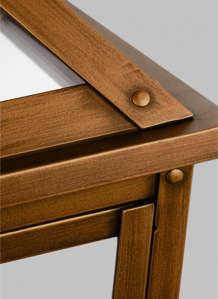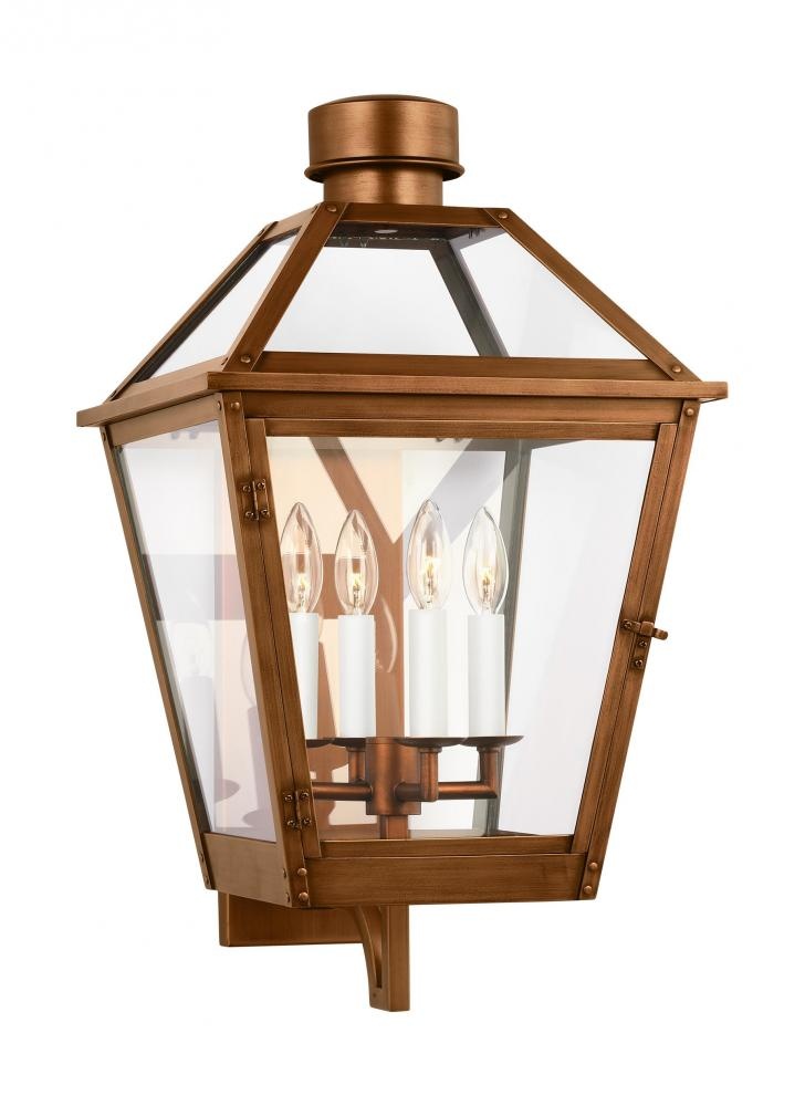 The Hyannis four light outdoor wall fixture in natural copper by Chapman & Myers has a classic copper lantern profile with top and bottom glass panels. Assembled with an overlapping metal frame which is accented by rivet details. Each light has a historically inspired spun metal chimney cap. The sconces are supported by a traditional bent metal architectural bracket.