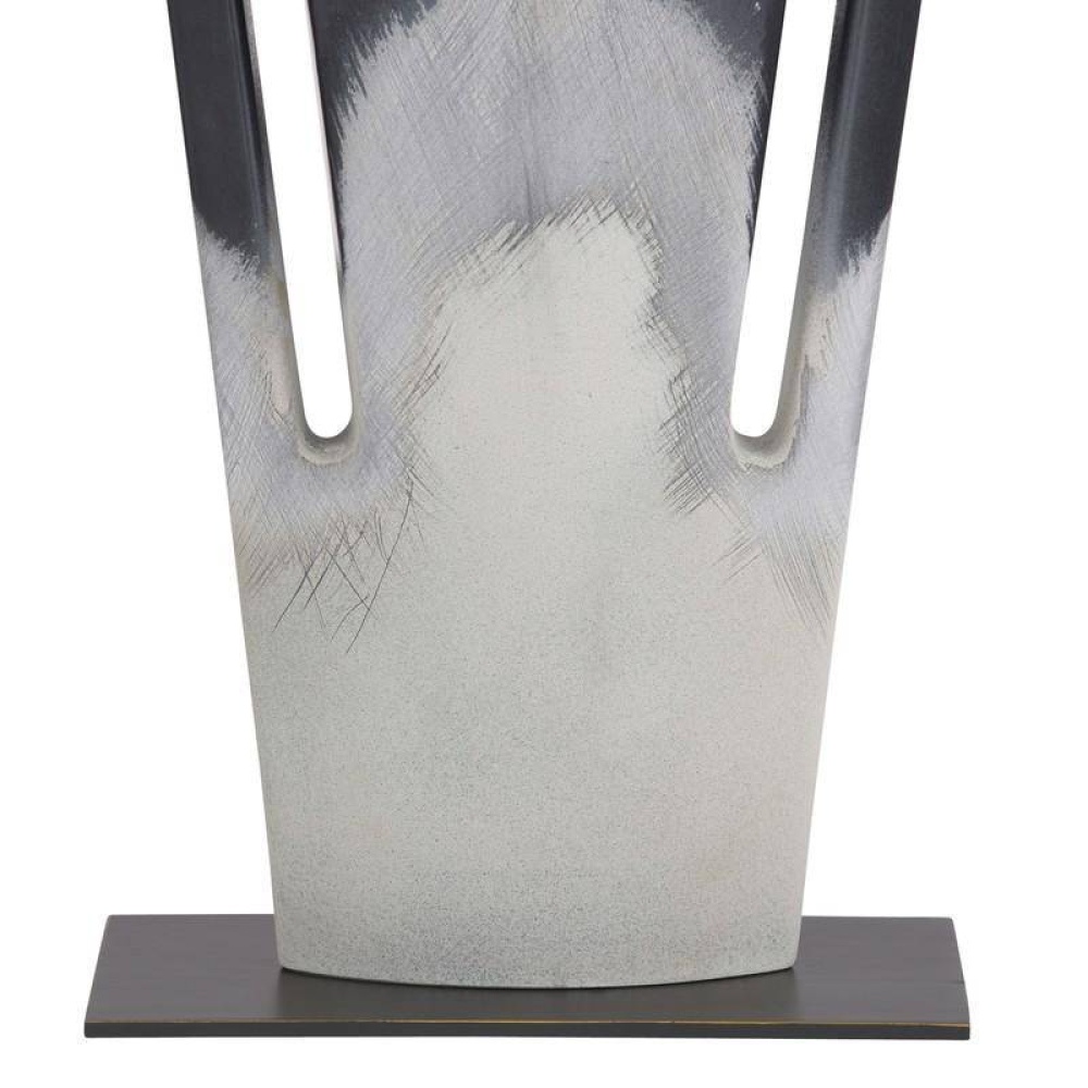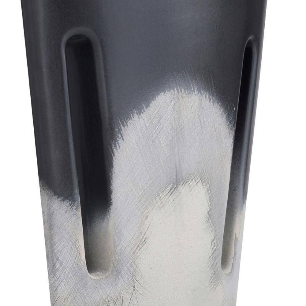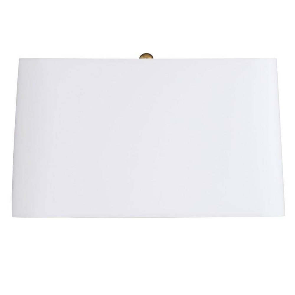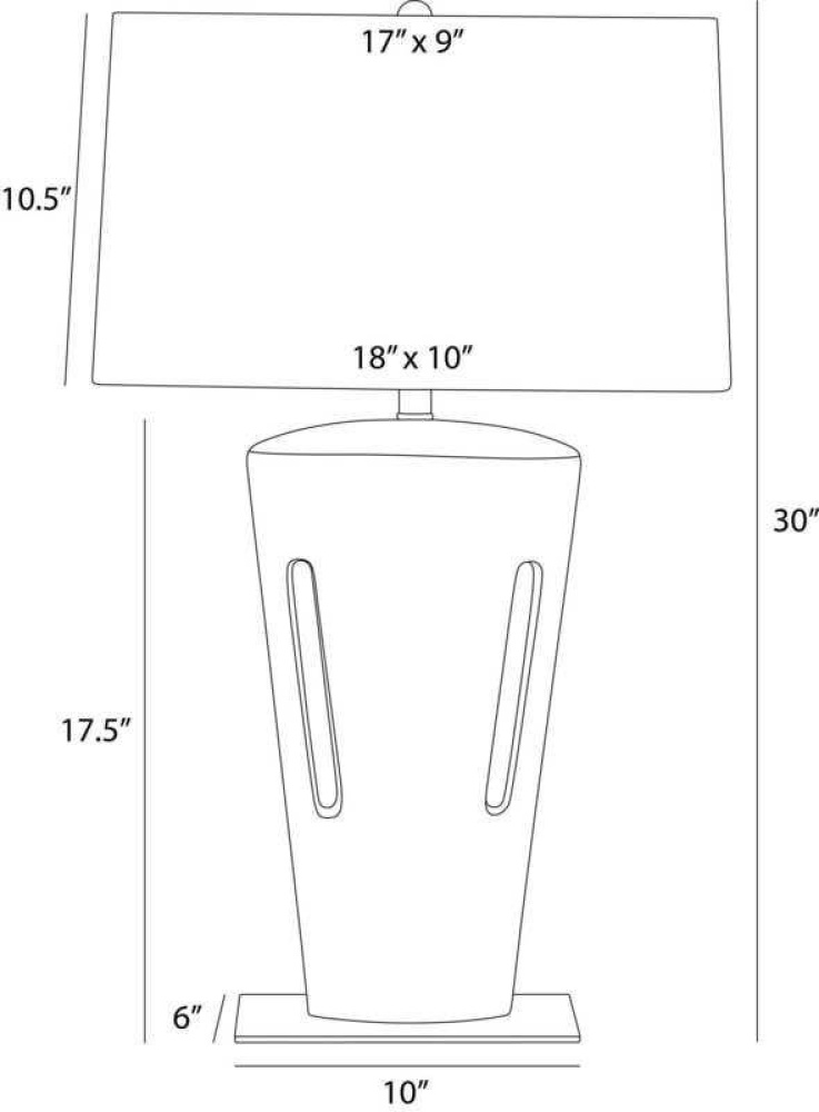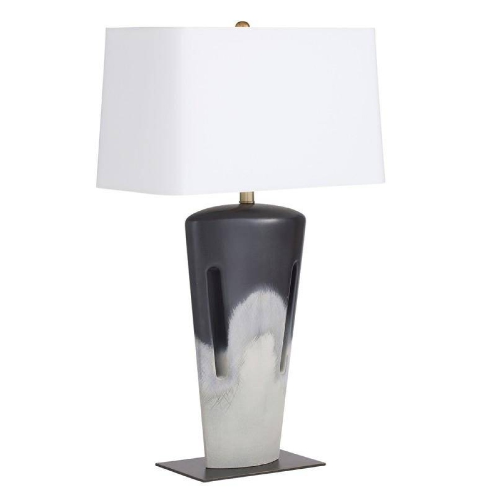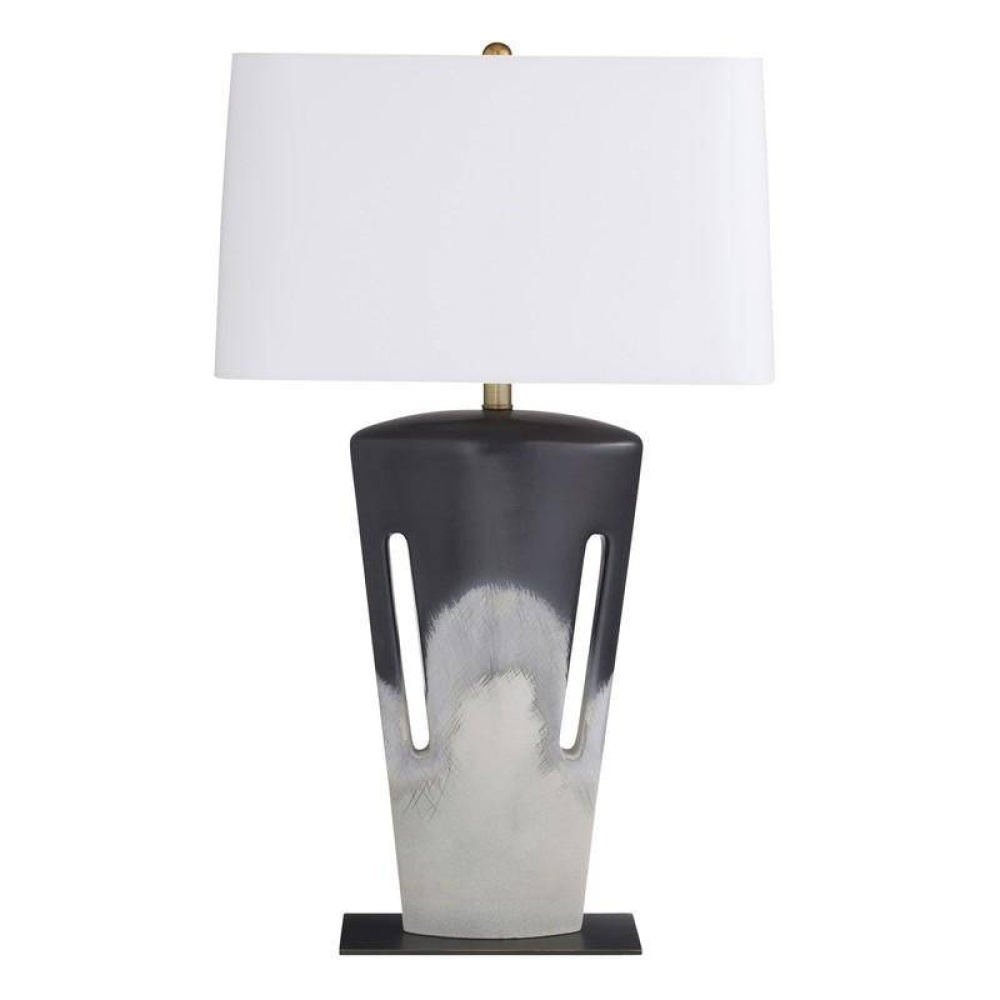 The angular form of our porcelain style offers an intriguing mix of positive and negative space, with a cross-hatched texture that emphasizes its craft. Cutout slots provide added interest, while the shoreline reactive glaze offers a gradient finish that shifts from deepest black to pure ivory. Finished with bronze steel base, an off-white microfiber rectangular drum shade lined in off-white cotton and an antique brass sphere finial. Finish will vary.