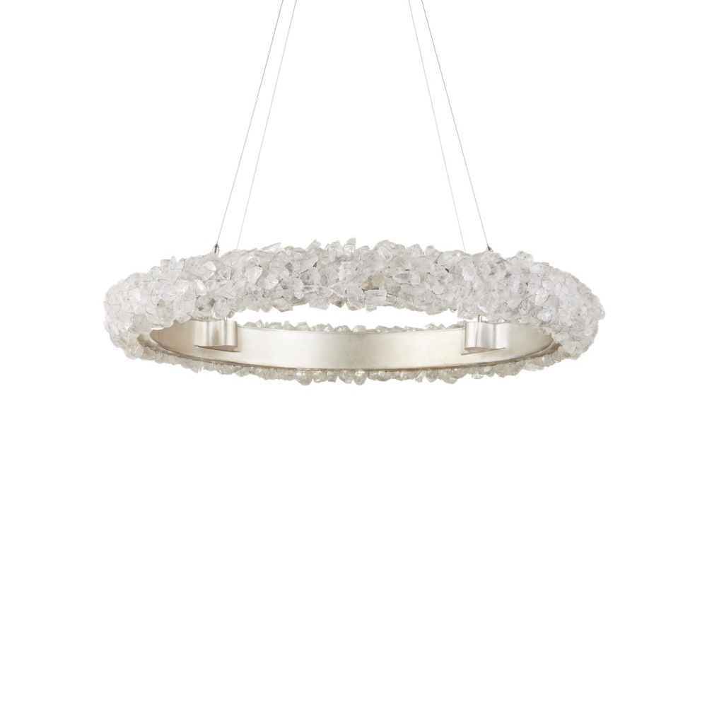 The Iconoclast Chandelier is a sparkling beauty with natural rock crystal affixed to a sturdy wrought iron frame in a contemporary silver leaf finish. Designed with attention to detail, the white wall sconce features rock crystals attached with very thin wire, creating visual interest without interfering with the luminosity of the stones. The pieces of pale material filter the light in the same way ice might, enhancing the beauty of this fixture. Adjustable from 24" to 148" with use of included chain/rod kit/cable. If your space calls for a longer drop, additional chain/rods/cable is available for purchase.