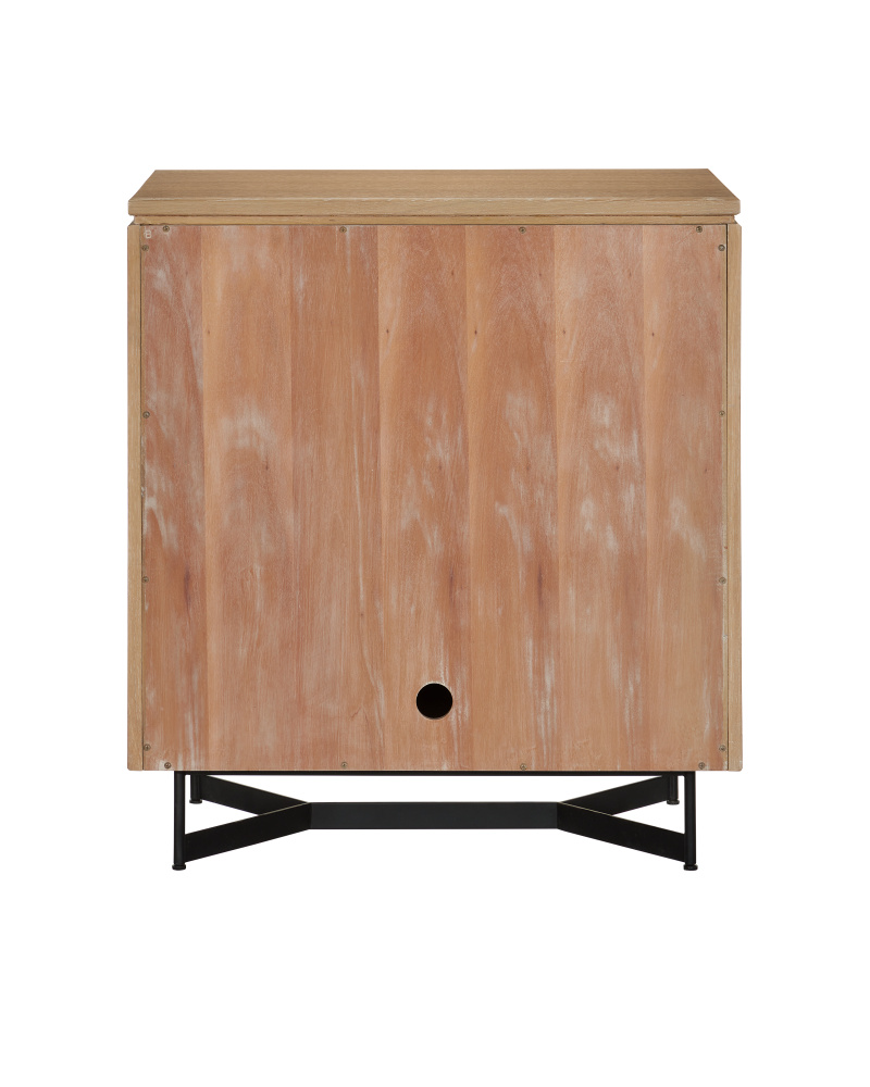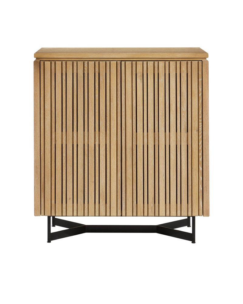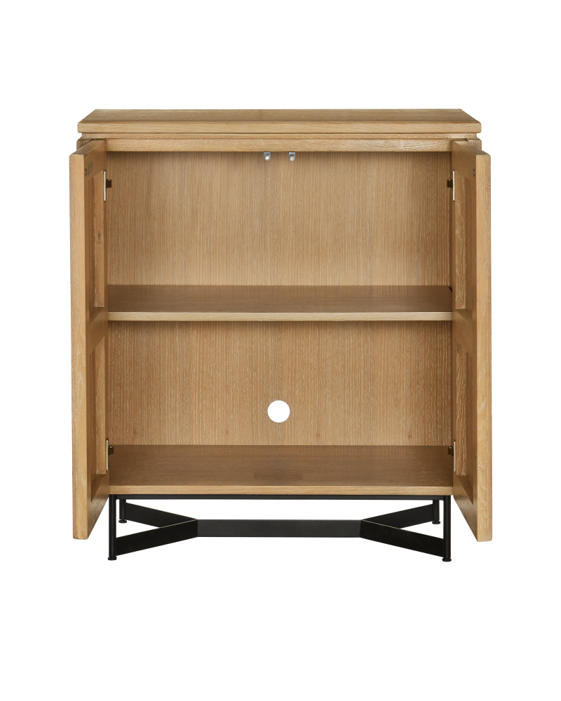 The Indeo Washed Oak Cabinet is an intricate piece of furniture. Made of two sizes of solid oak slats that are clad in oak veneers and inset into the frame, the piece is covered in a washed oak finish. The two-door cabinet sits cleverly on iron legs with generously sized stretchers connecting them in a black finish. The cabinet has cord management openings in it for electronics.