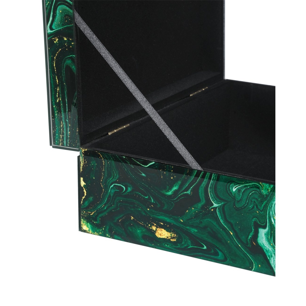 Despite looking like they are made of stone, the Interstellar Green Box Set's surfaces are the result of green swirl paper being encased in glass. The coating brings the exteriors of the decorative boxes an unparalleled sheen. The interiors are covered in black felt, and the small one will nest into the large one. Because these accessories are handmade, the patterns will vary.