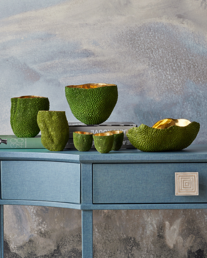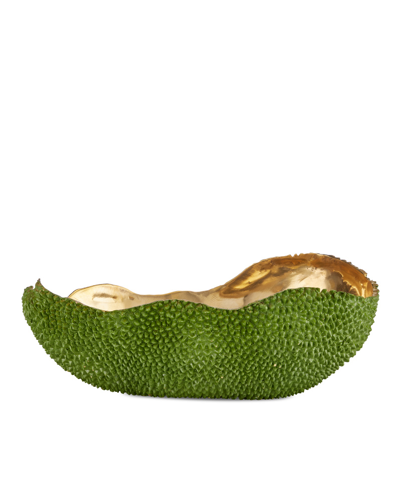 The Jackfruit decorative vessels include the Jackfruit Oval Green Bowl that is made from a lost-wax process so it reads as if it is covered in the skin of the jackfruit. The inside of each bronze bowl is a brilliant gold made of polished solid bronze, which will need to be cleaned from time to time to maintain its sheen. The green decorative vessel is watertight so it will not leak.