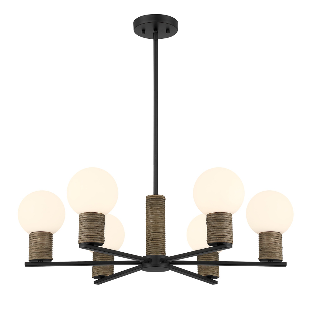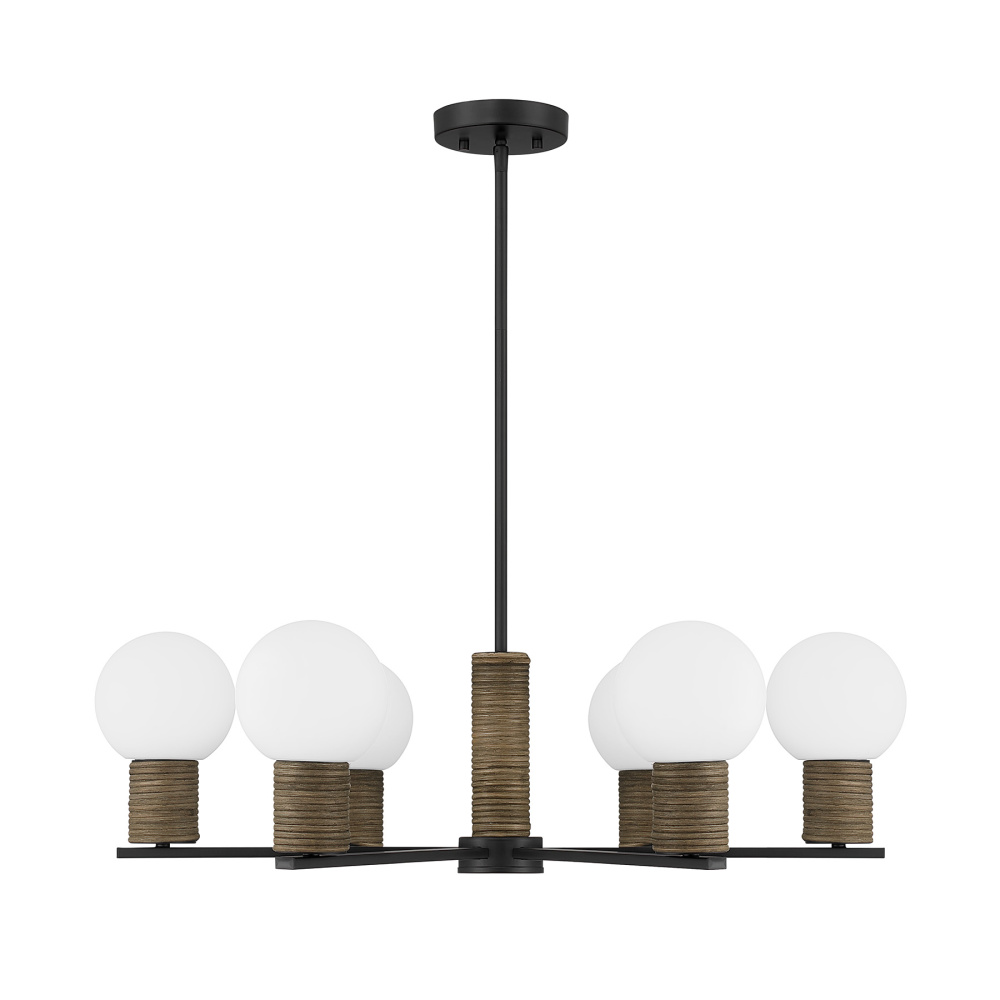 Bring relaxed, modern character into your home with the Savoy House Jarrell 6-light chandelier. Dark rattan accents wrap around orbs of white opal glass, creating soft texture that stands out beautifully against the Matte Black finish. Jarrell is 30" wide and offers an adjustable height ranging from 9.5" to 63". It uses six candelabra size bulbs of up to 60 watts each (bulbs not included) and comes with four 12" downrods and one 6" downrod.