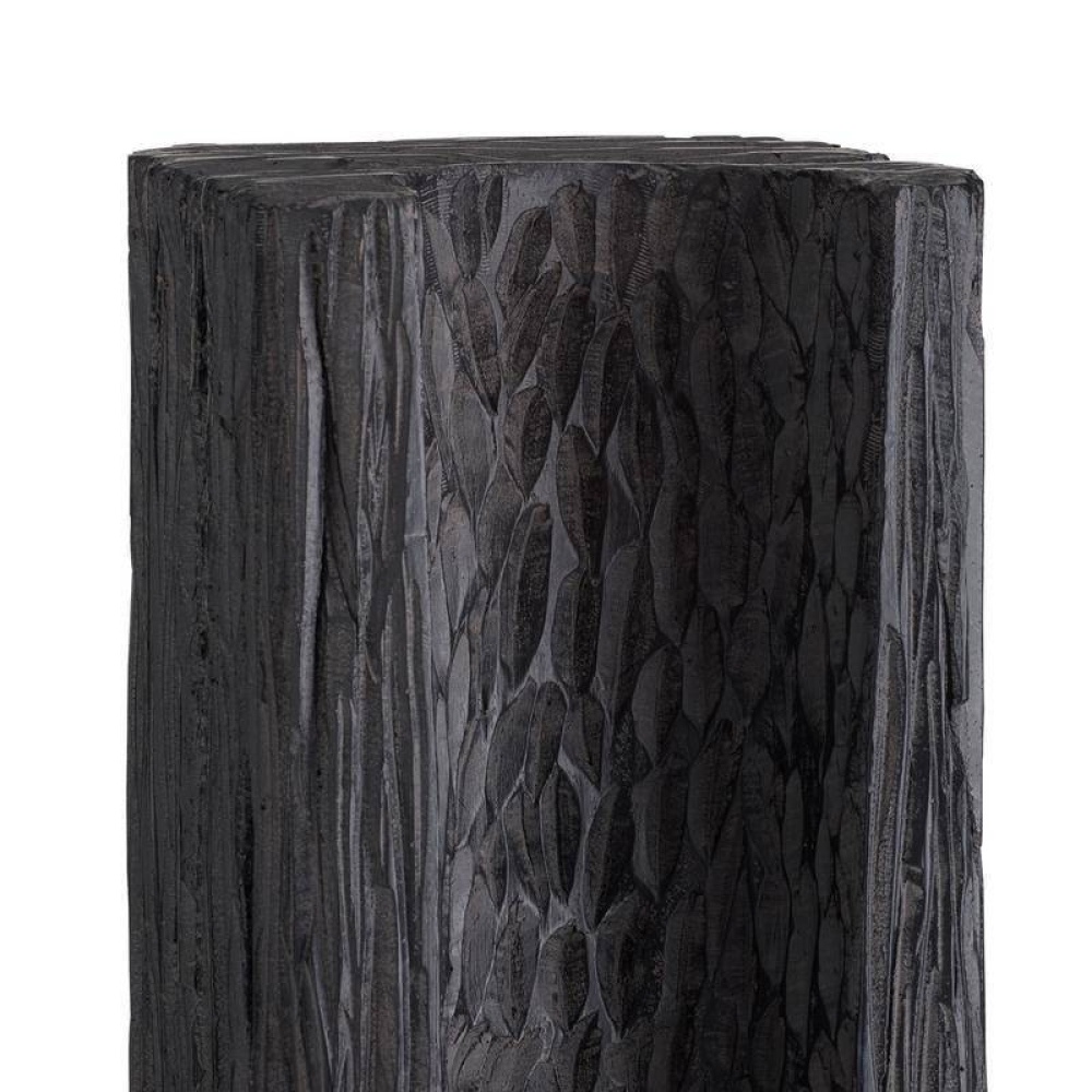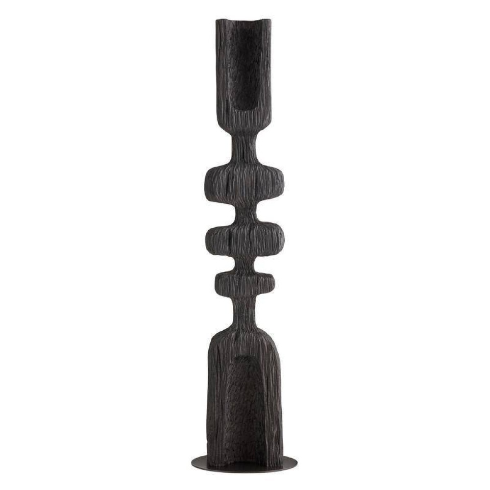 Designed to draw the eye, this monolithic sculpture of ebony resin makes a dynamic accent for any corner. The totemic-inspired shape resembles a fishbone, with a grooved texture that recalls sea-worn driftwood. Mounted on a circular bronze steel base.