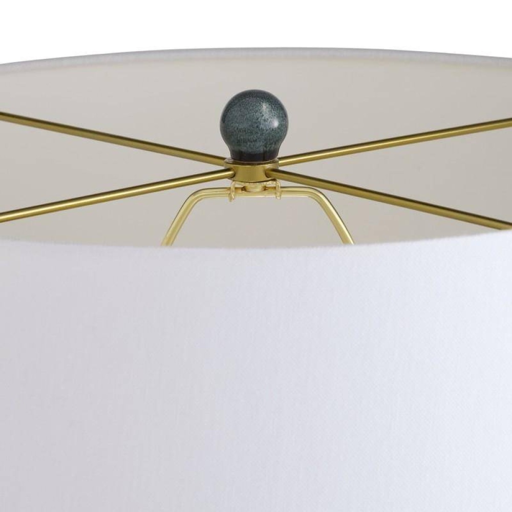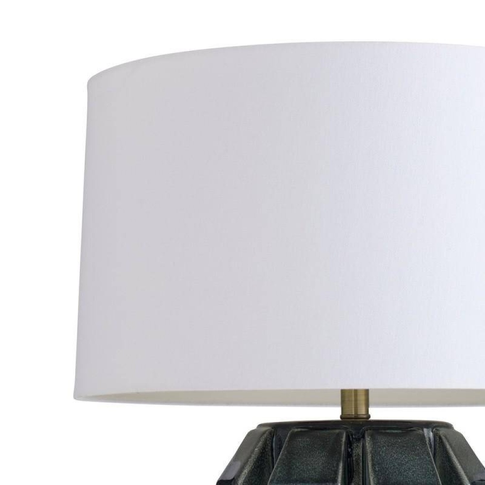 Shaped and glazed to create playful movement, our ceramic Journey is a modern update of a hand-thrown lamp from the mid-century. The zig-zag form is glazed in ocean reactive for subtle gradation and accented with antique brass hardware. Topped with a white linen drum shade and matching ceramic finial. Finish will vary.