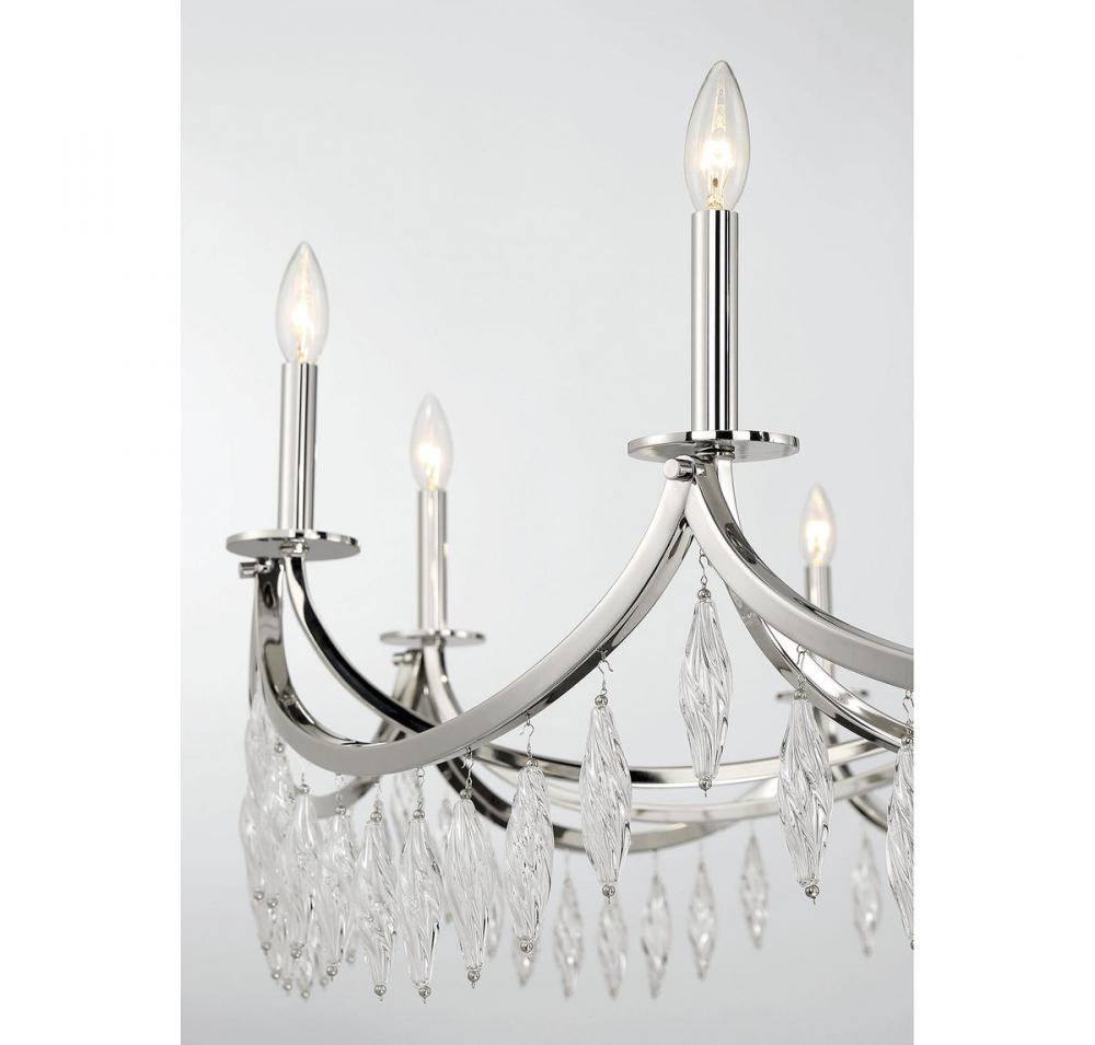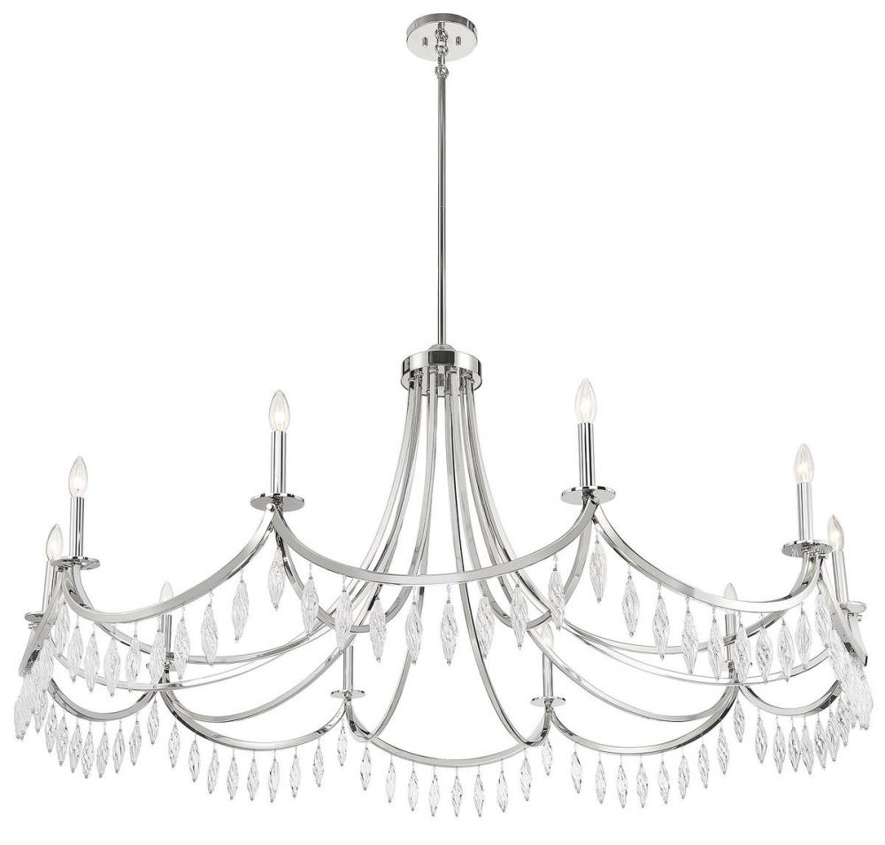 Grand spaces need grand lighting - and this Savoy House Kameron 10-light chandelier is the perfect choice for grand illumination. Its magnificently curving arms, connected in a scalloping pattern, are decorated with spiraling crystals that are sure to catch the eye. Finished in polished nickel. Kameron is 60" in width and it has an adjustable height ranging from 38" to 84". It uses ten candelabra size bulbs with a max of 60 watts per bulb. Comes with four 12" downrods and one 6" downrod, plus 80" of cord.