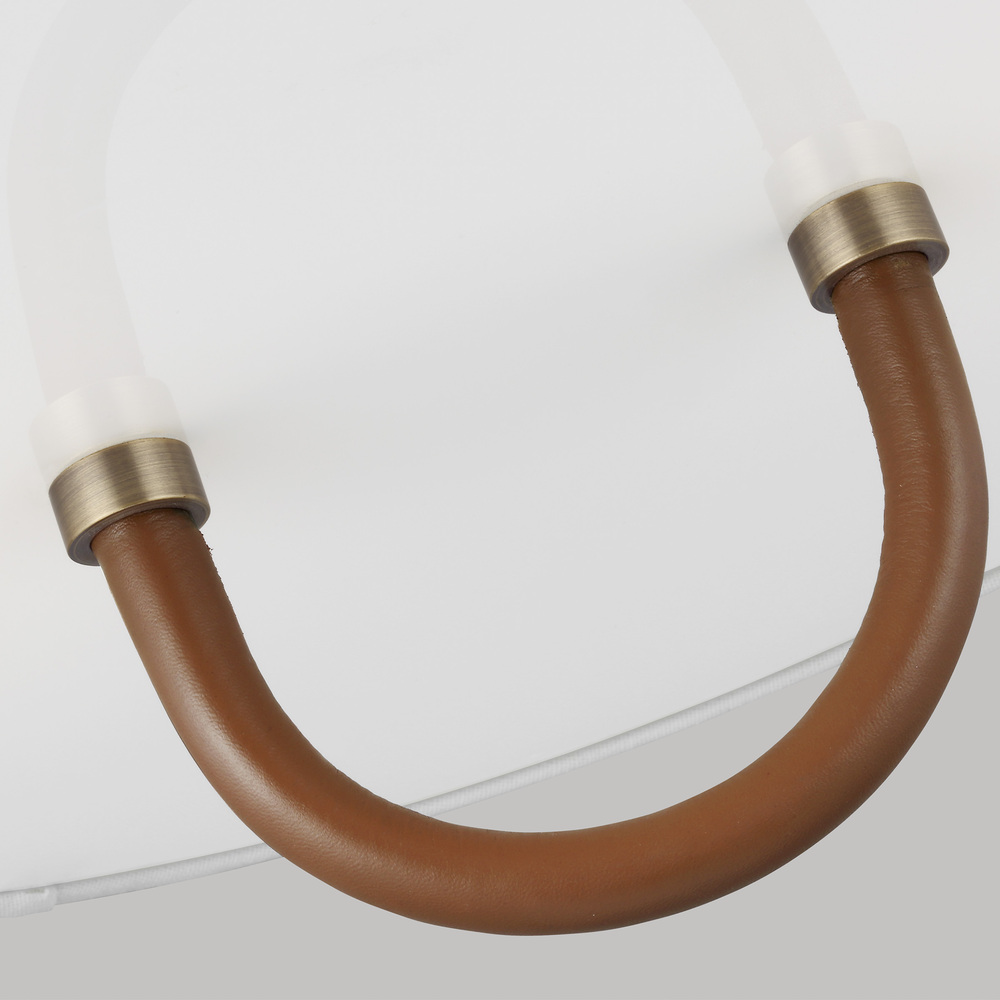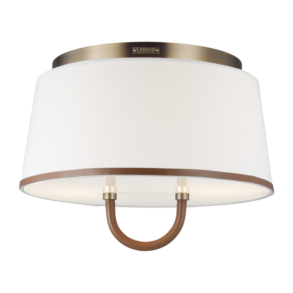 The Katie two light flush mount fixture in time worn brass features a leather stirrup stemming from a milk white glass diffuser and white linen fabric shade.