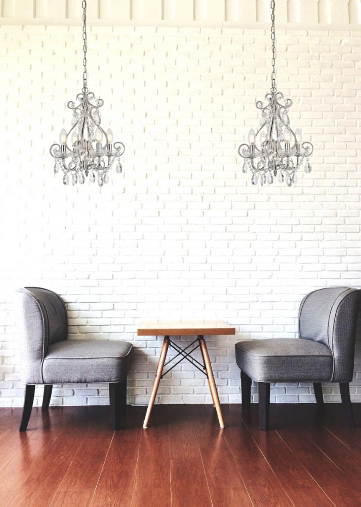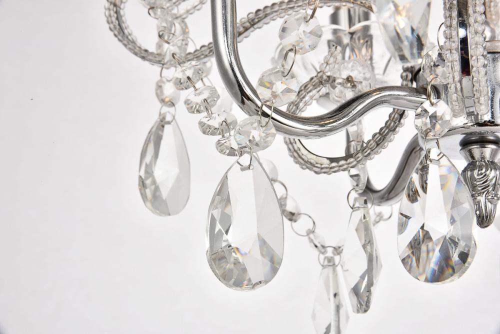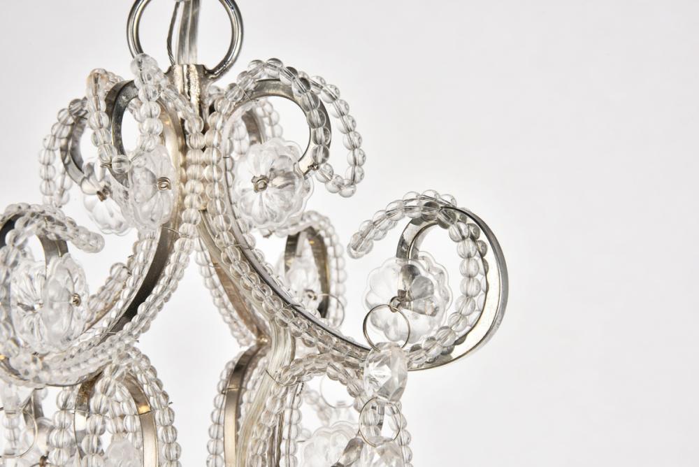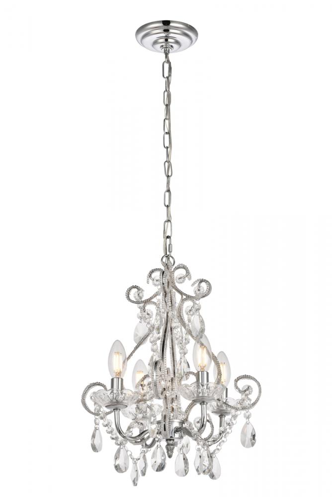 Experience the grandeur of classic rococo ornamentation in the compact fixtures of the Kato collection. These pendants feature fanciful curved, beaded arms festooned with beautiful strands of cockled Crystal flowers and accented with royal-cut Crystal almond droplets. Available in a polished-Black finish with Black Crystals or a Chrome finish with clear Crystals. Ample illumination is provided by four candelabra-style bulbs (Not included) atop coordinated bobèches.