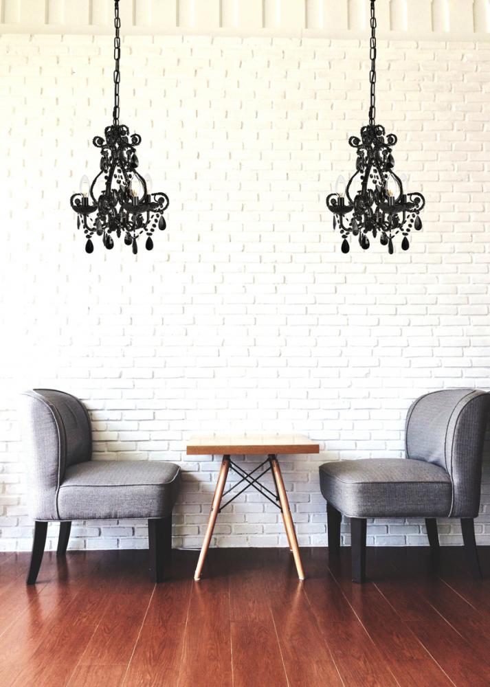 Experience the grandeur of classic rococo ornamentation in the compact fixtures of the Kato collection. These pendants feature fanciful curved, beaded arms festooned with beautiful strands of cockled Crystal flowers and accented with royal-cut Crystal almond droplets. Available in a polished-Black finish with Black Crystals or a Chrome finish with clear Crystals. Ample illumination is provided by four candelabra-style bulbs (Not included) atop coordinated bobèches.