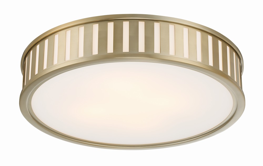 The contemporary Kendal collection makes a statement with its graphic uniform pattern. Its metal frame surrounds white glass in this elegant drum-shaped ceiling mount. The high contrast of Vibrant Gold, Black Forged, or Polished Nickel against white glass is a great way to add a touch of drama to a room.
