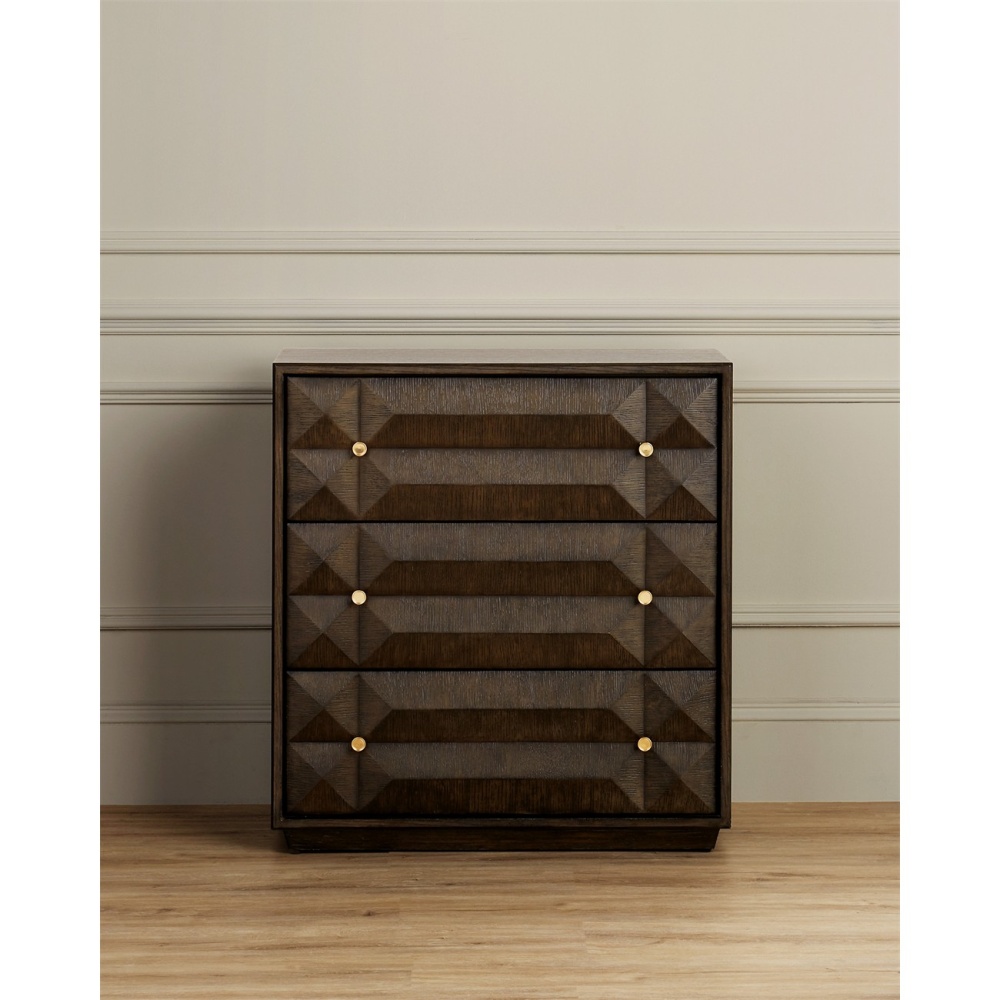The Kendall Dove Gray Chest has a geometrically striking profile created by the interplay of peaks and valleys on its drawer-fronts. It is made of oak solids and veneers with surfaces in a dove gray finish that have been wire-brushed to accentuate the grain in the wood. The faceted dark brown chest is jewel-like, the metal pulls in a polished brass finish adding a glimmering touch to the warmth of the gem-like chest.