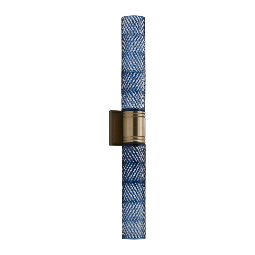 Inspired by the traditional Japanese craft of Edo Kiriko, the indigo colored 24% lead crystal diffusers of this fixture family features precise, herringbone cuts that reveal a clear layer underneath. The aluminum, Winter Brass (WB) body holds each glass in place, and the LED light sources provide ample downlight, adding a functional, yet colorful statement fixture to any space.