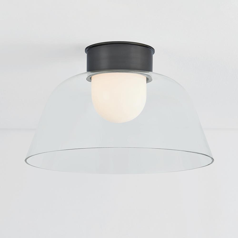A celebration of the beauty of pared-down forms, Lakeside features an opal glossy inner diffuser surrounded by a clear outer glass layer. Shaped like a graceful bowl, this flush mount forgoes ornamentation save for its extra-tall metal canopy. Available in Aged Brass or Distressed Bronze finishes, the streamlined metalwork adds a decorative note to the minimalistic design.