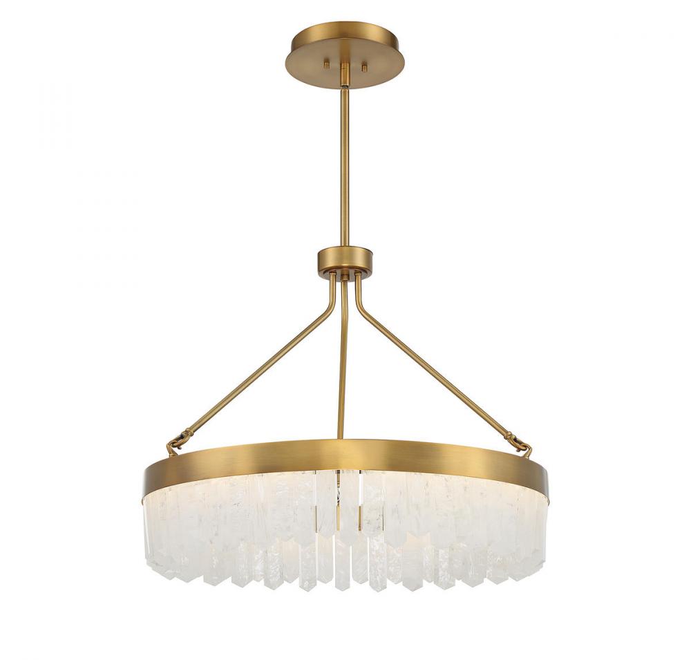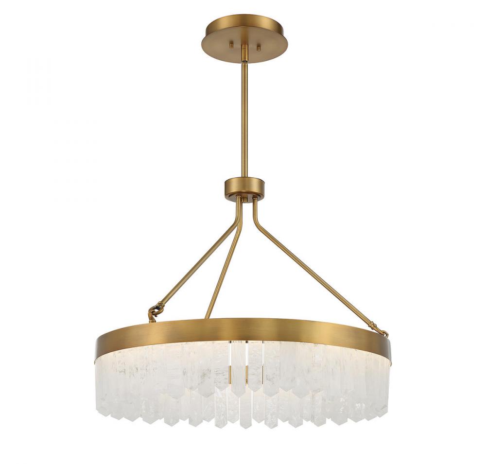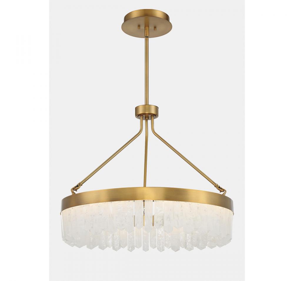 Create a breathtaking glow with the Savoy House Landon pendant, which features a circular shade adorned with dramatically-cut pieces of calcite that are illuminated from within by integrated LED light sources. The warm brass finish adds to the bright, warm look. Landon is 22" in height and 27" in width. It comes with four 12" downrods and one 6" downrod, plus 80" of cord.