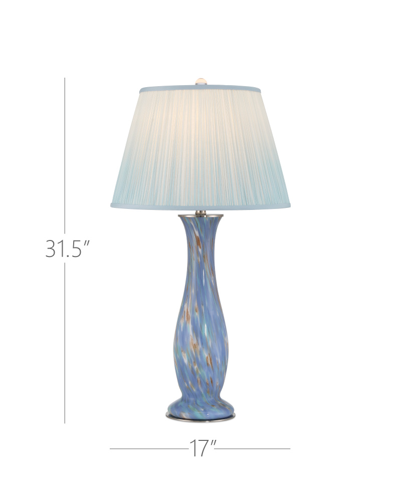 The Lapis Blue Table Lamp has a gleaming glass body on which streaks of white, deep blue, and iridescent copper twist together to create a mesmerizing Easter-egg effect. Fitted with a pleated ombré blue shade, the body was inspired by the tallest vase the prominent French glassmaker and designer Charles Schneider ever made. The swirling pattern brings the lamp a strong sense of movement achieved through a painstaking combination of marbling and glass-fusing techniques, which are difficult to do in tandem.