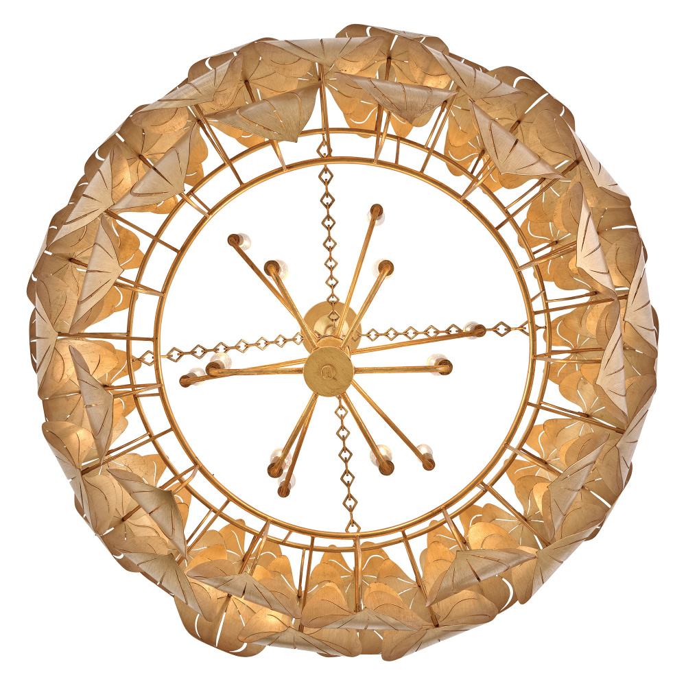 Inspired by the grand leaves and distinct veining of anthurium plants, found in the tropical cloud forests of South America, Camille brings botanical beauty to your living space. Each Distressed Brass layer is artfully laser-cut, shaped, and hand-painted with gold leaf to create a luxe transitional design, suspended by diamond-shaped chains and a tapered canopy.