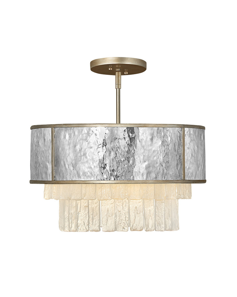 Reverie features a fanciful combination of finishes and shapes to create an opulent transitional silhouette. The robust, hammered stainless steel drum encompasses the textured crystal accents, which create a stunning profile from below. Metal binding adds an artisan touch that completes the look.