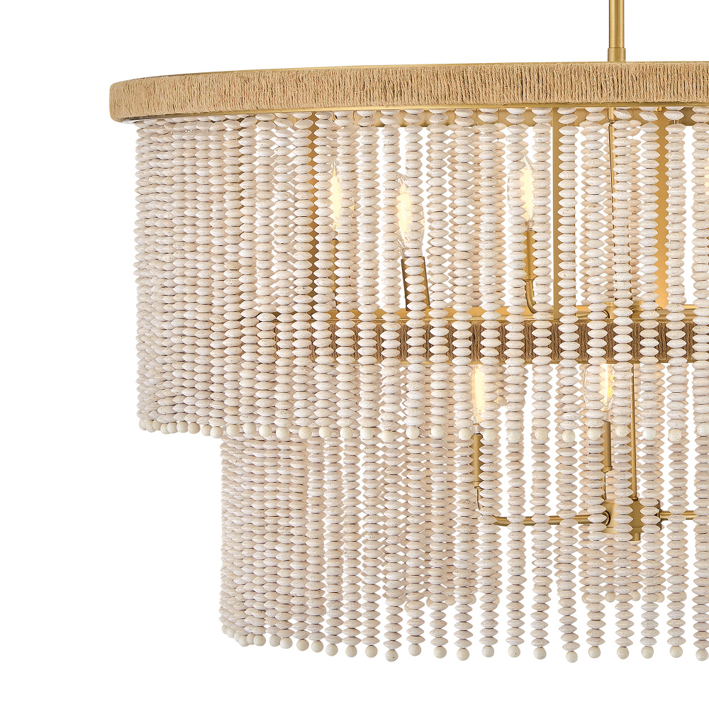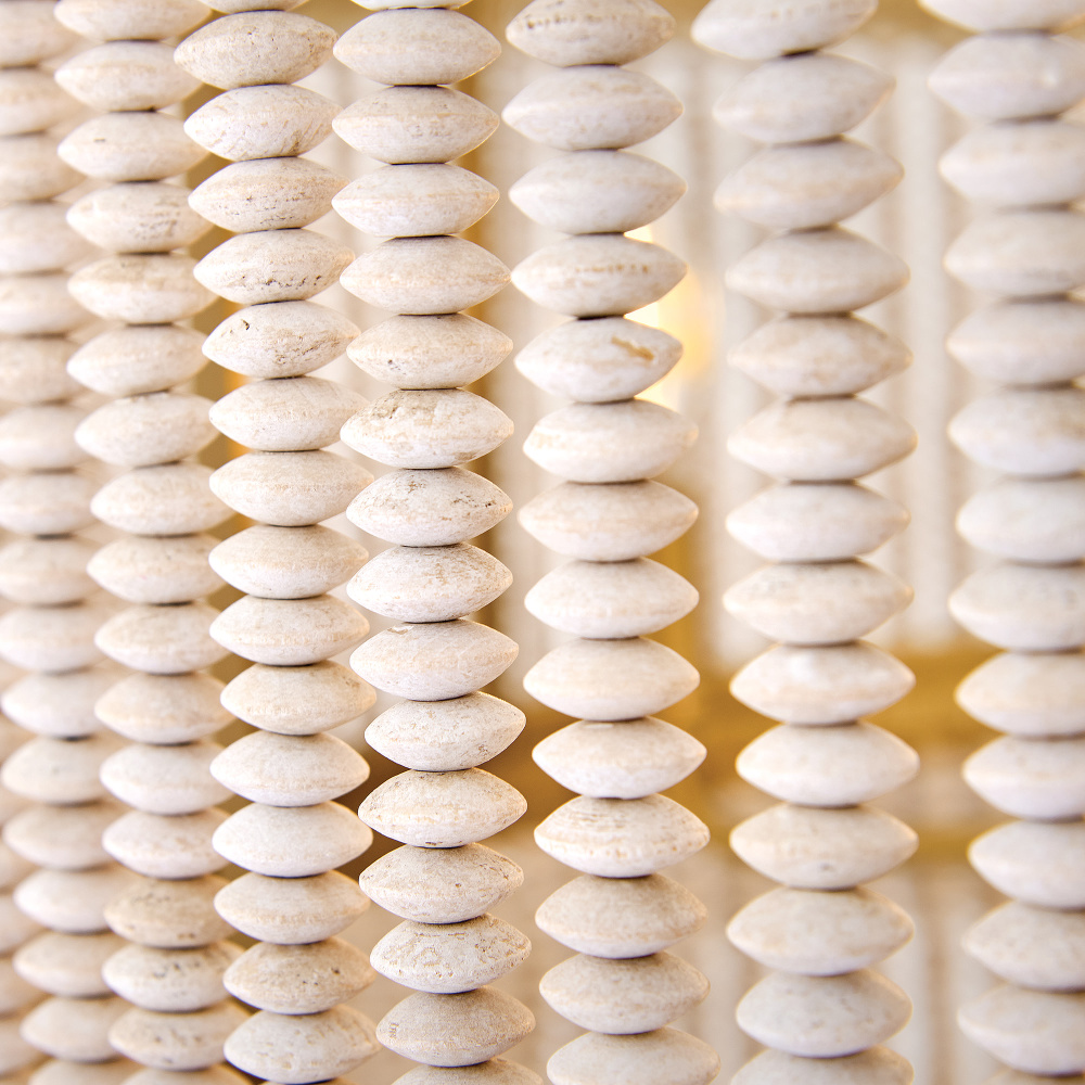 Indra blends coastal styling with an elegant transitional silhouette to fill your space with a naturally inspired atmosphere. A hand-strung curtain of stacked, taupe wooden beads diffuses warm illumination, while a frame hand-wrapped in natural fiber jute rope adds a touch of organic texture to your decor.